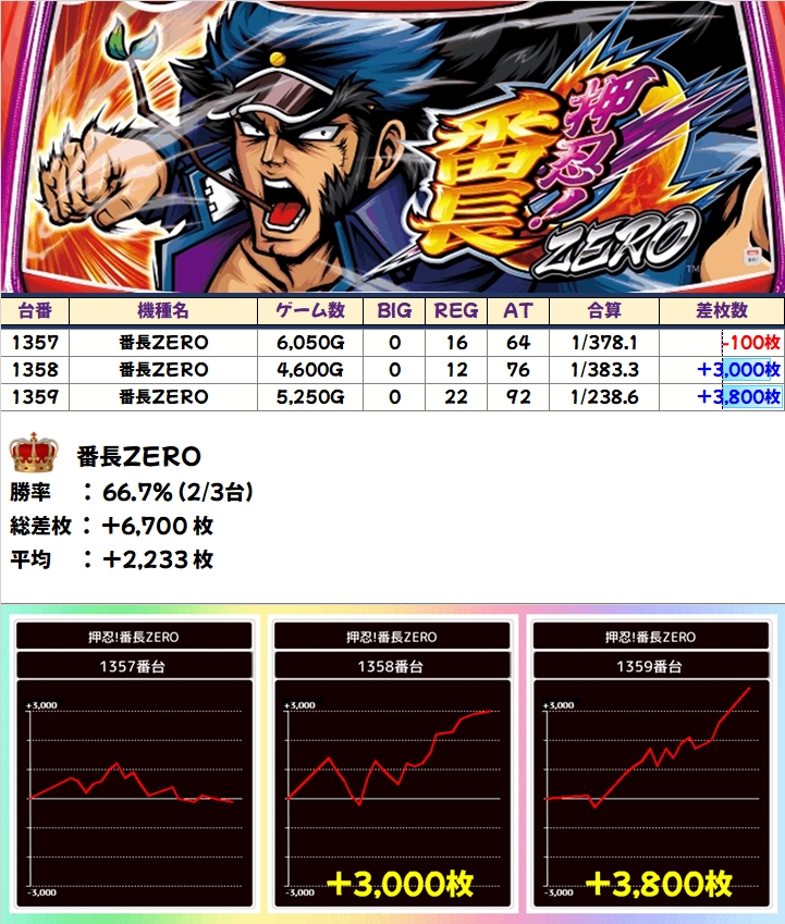 いまだに根強い人気の「番長ZERO」も全台系に! 3台中2台は綺麗な右肩上がりで+3000枚以上を記録!