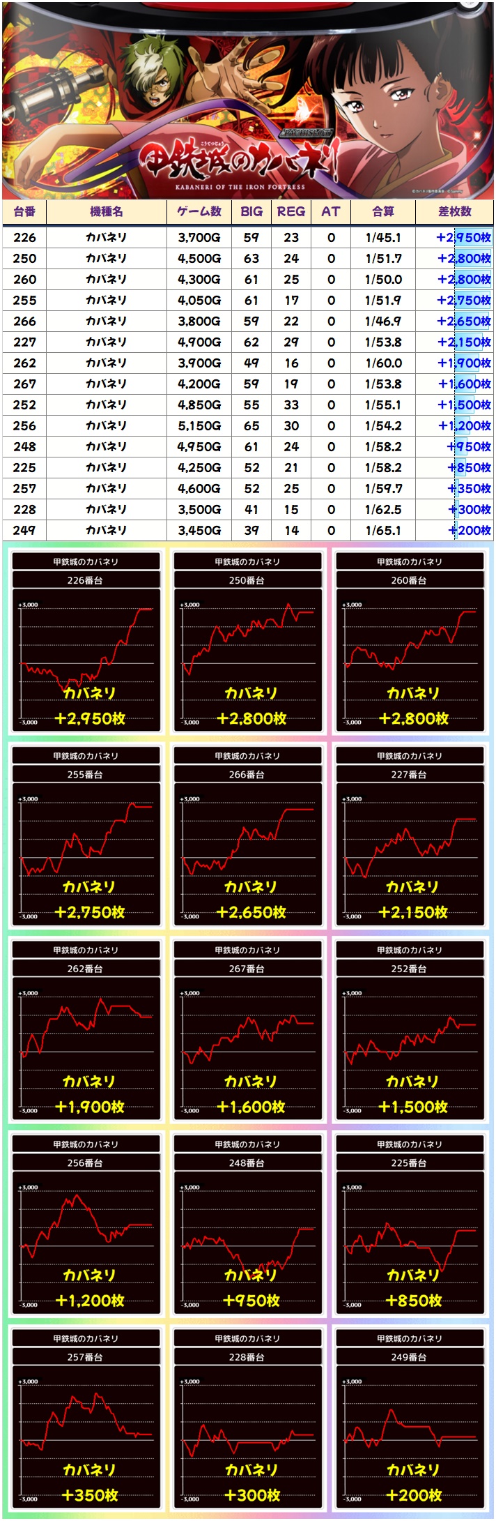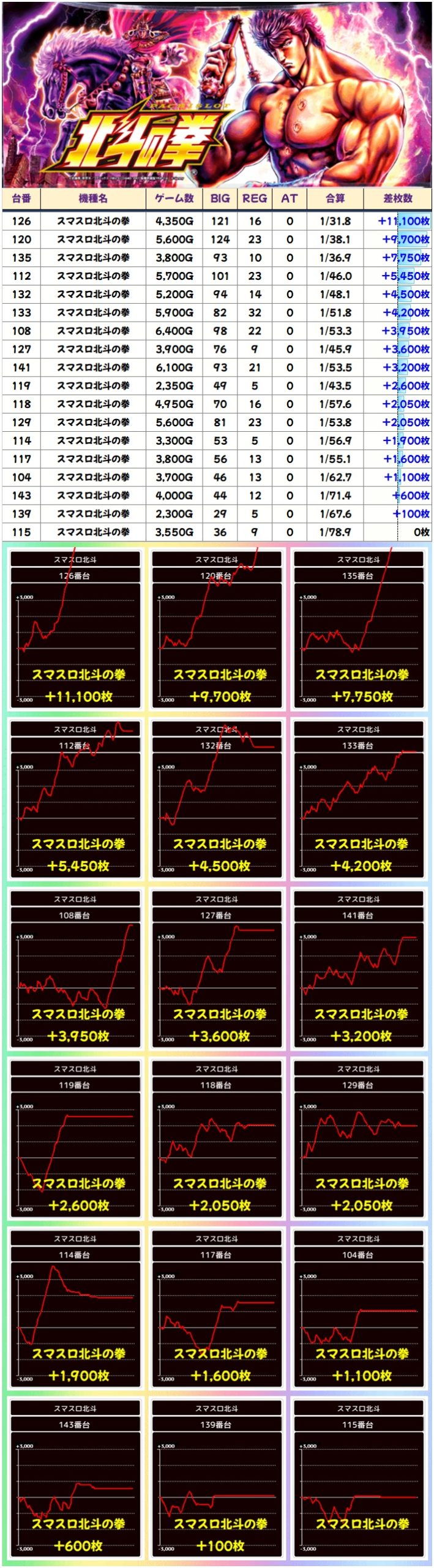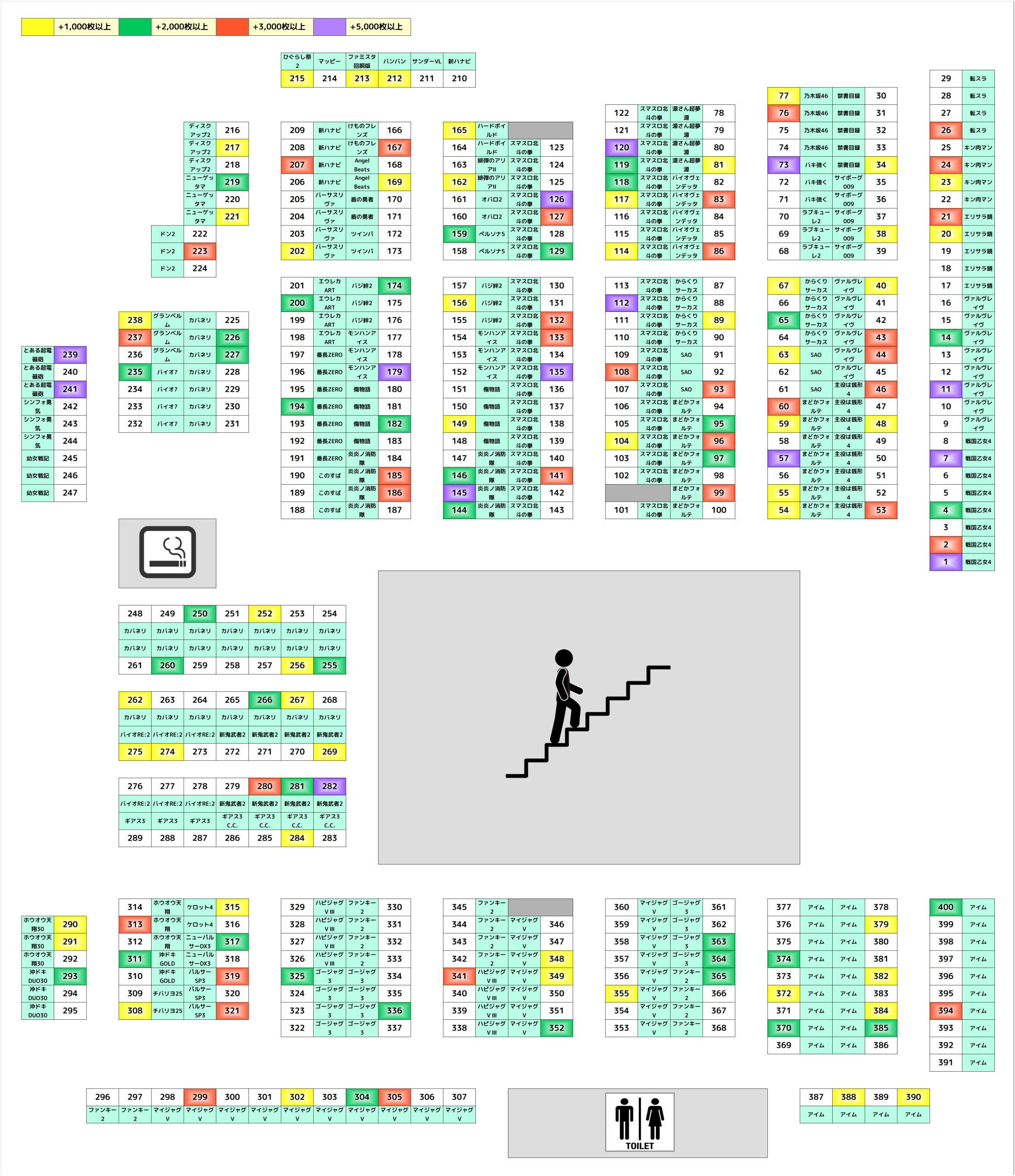 今回はいつも以上に【全台系】【ニブイチ系】が多数用意されていたと予想。もちろんカバネリ&北斗は相変わらずの高配分で、ジャグ系も全体でプラスと、お馴染みの仕掛けの数々で好結果となりました。そして今回は並び仕掛けも用意されていた可能性が高そうでした!