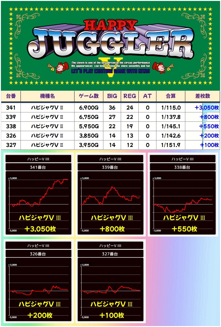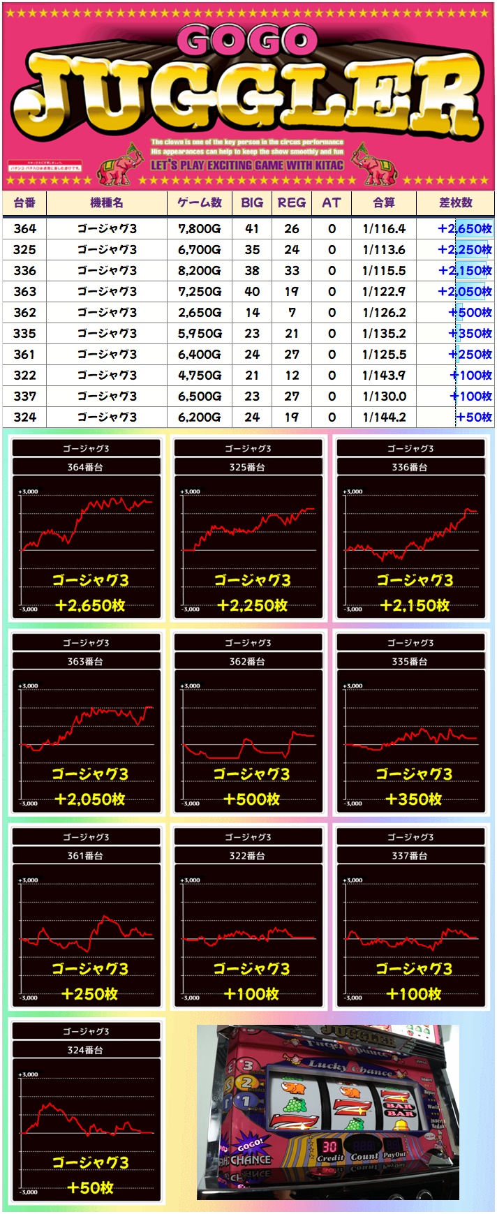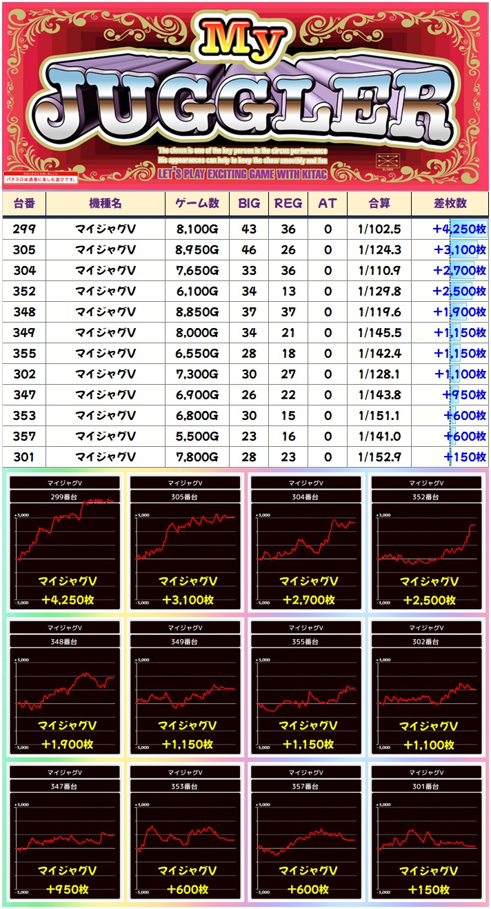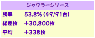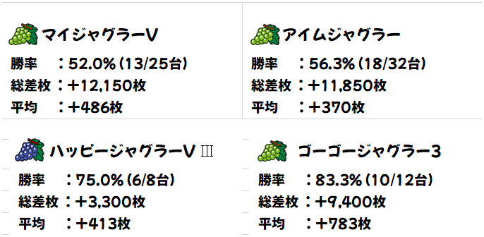 ジャグは全体でキッチリとプラスに! ファンキー2以外の4機種は全てプラス&ニブイチ以上の高配分! ゴージャグ3はもしかしたら全台系だった可能性も!?