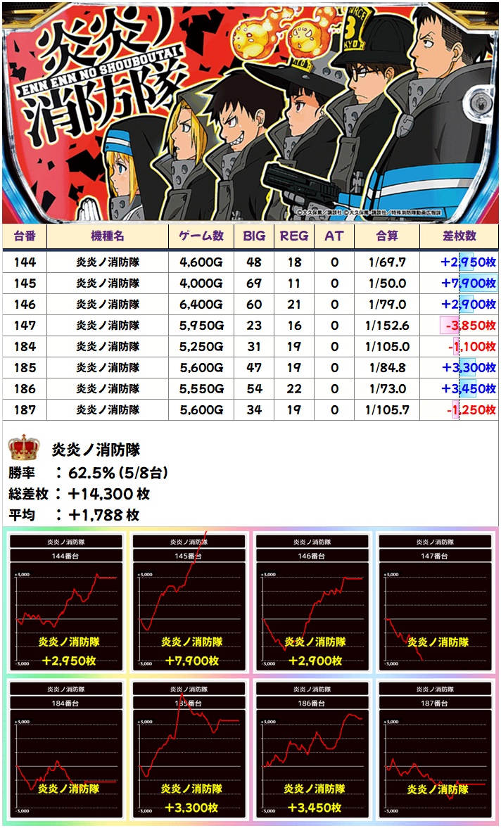 続いては炎炎の消防隊!こちらは5/8でプラスと、ニブイチ以上はあったのかと予想。ちなみに144-146番台は並び仕掛けだった可能性が高そう!?