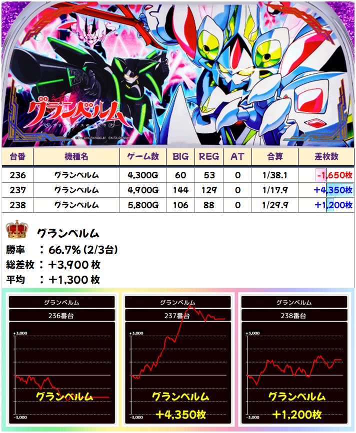 グランベルムは2/3でプラスの平均+1300枚! グランベルムは徐々に人気出てきてますよね。
