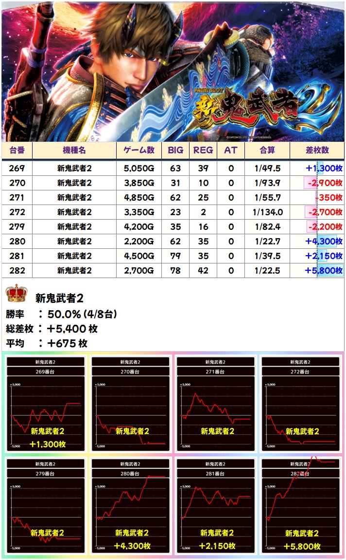 新鬼武者2からも勝率4/8とニブイチに。280-282番台は並び仕掛けっぽい挙動だった!? 今回は並び仕掛けが多かったみたいですね。