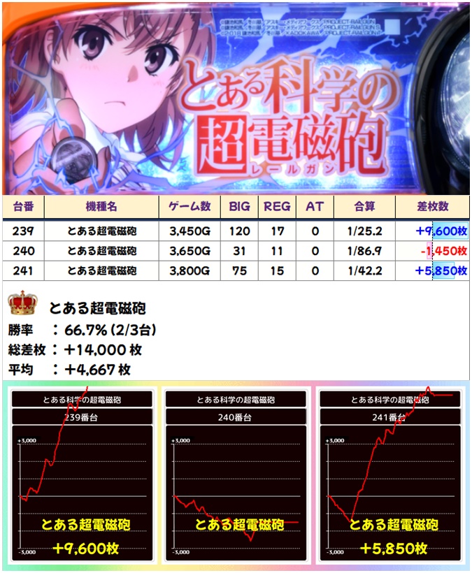 まずはとある超電磁砲から! 2/3でプラスの平均+4667枚と超好結果に!1台マイナスではありますが、プラス台の挙動が良すぎるだけに、全台系だった可能性が高そうです!
