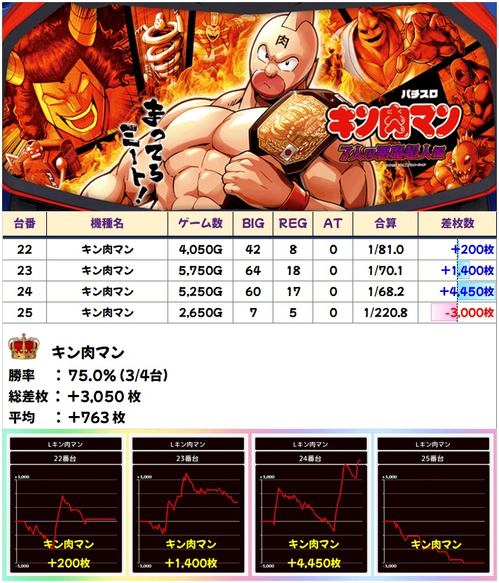 キン肉マンからも3/4でプラスとニブイチ上の勝率に。24番台からは+4000枚オーバーも!
