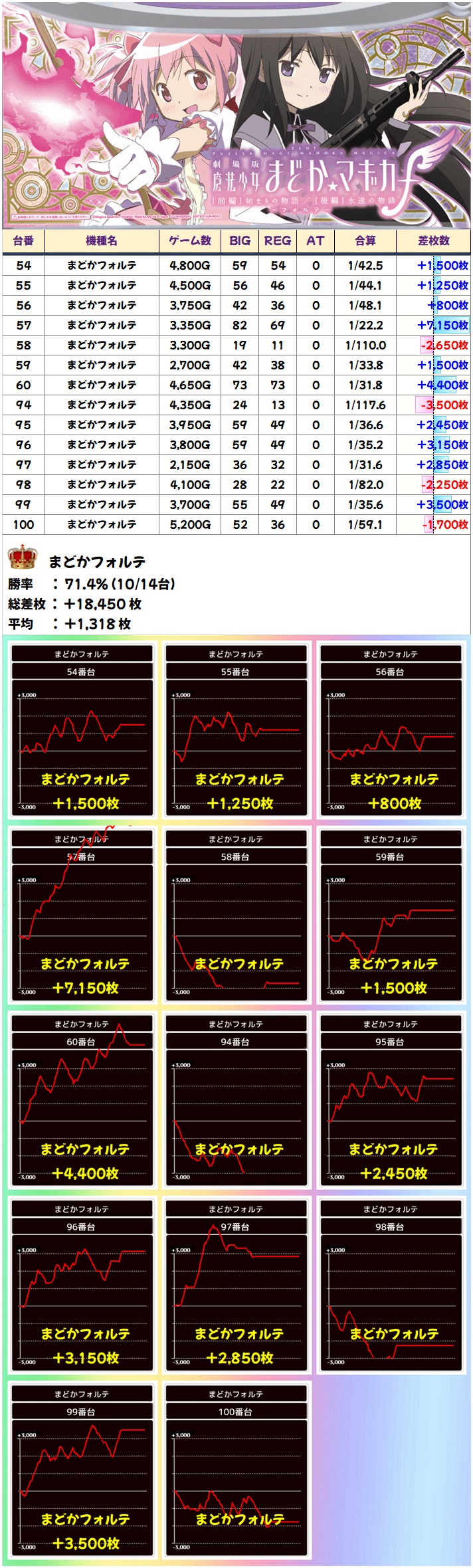 まずは最新台のまどかフォルテから! こちらは10/14でプラスの平均+1318枚と好結果に。ニブイチ以上は間違いなく、もしかしたら全台系だったかも!?