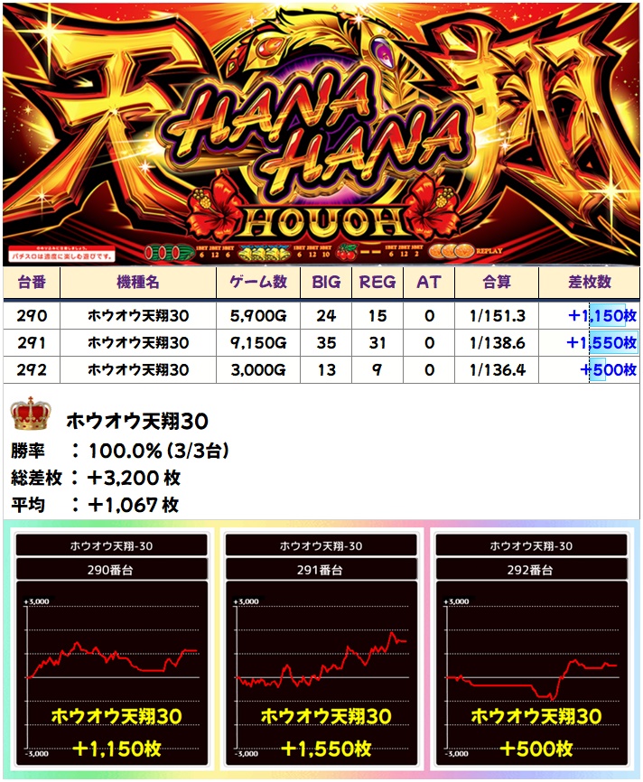 ホウオウ天翔30からも全台プラス&平均+1067枚と、こちらも全台系挙動! 292番台はもう少し打ち込みが欲しかった!?