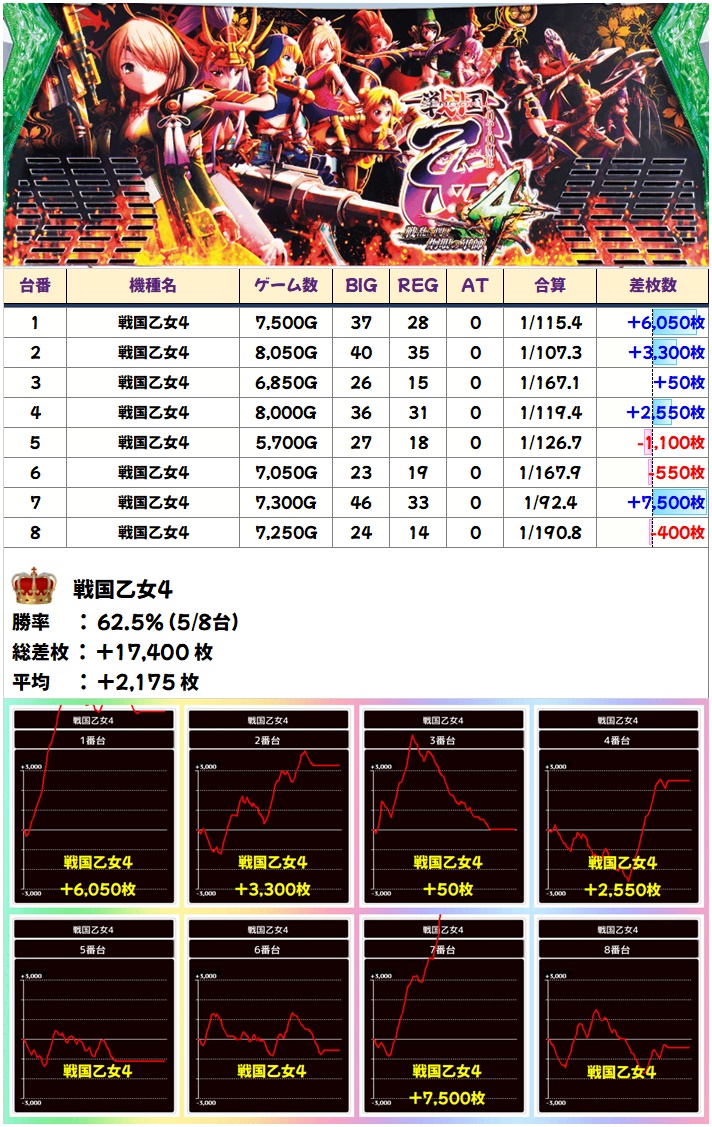 戦国乙女4からは5/8でプラスの平均+2175枚! こちらも並び仕掛けアリ&6000枚オーバー台が複数アリな状況でした。