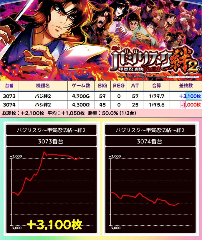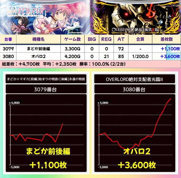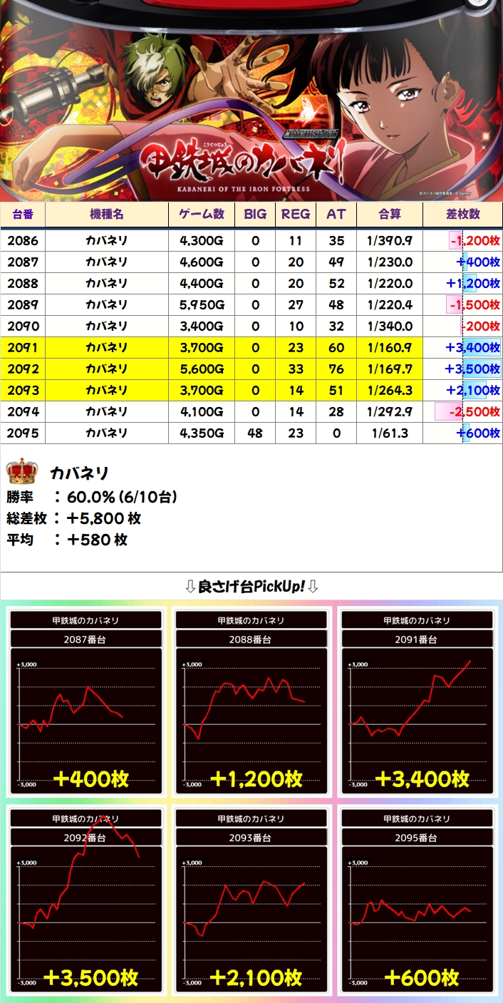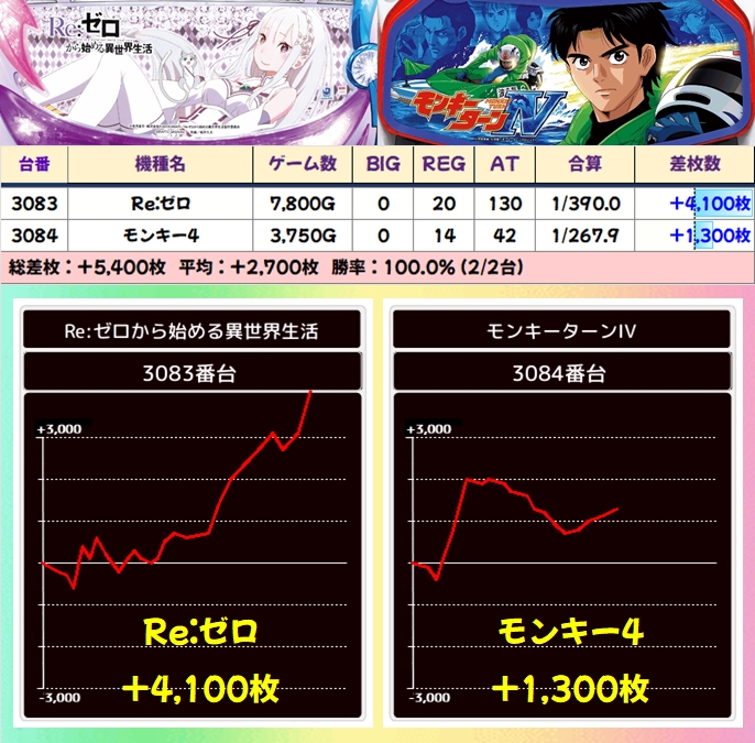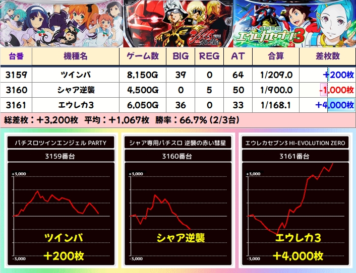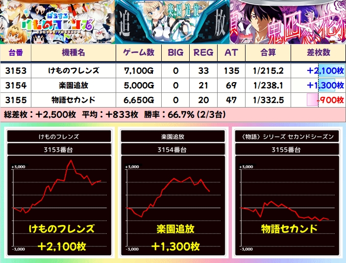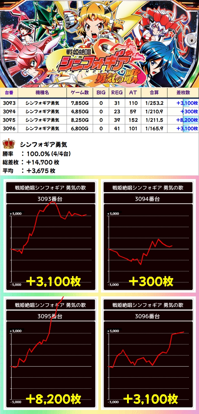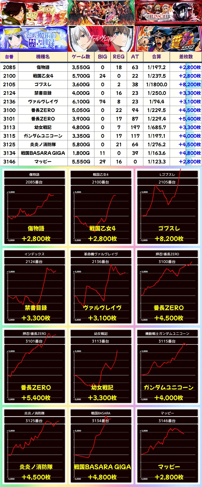 データのほうを見てみると、4台中3台が+3000枚オーバーと大幅プラスとなっており、3095番台は+8200枚と爆出し!