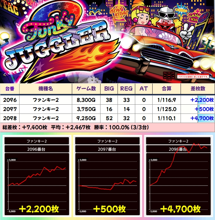 ジャグラーはファンキーに3台並びが用意されており、3台ともプラスかつ台平均+2467枚と優秀な結果に!