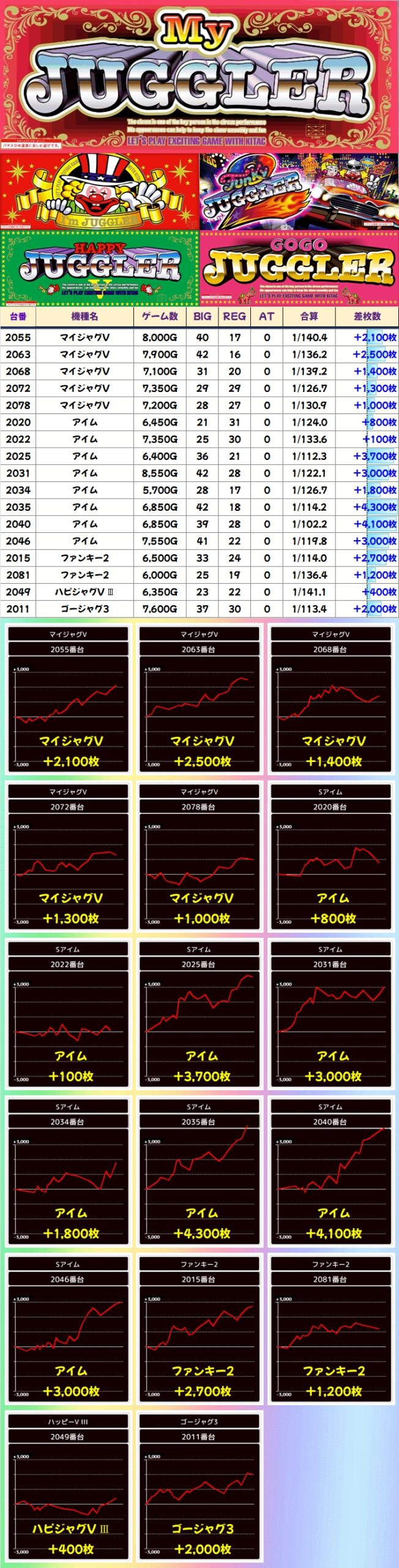 ジャグラーは単品も大量に用意されており、アイムは平均+388枚、とファンキーは平均+617枚と全体でもプラス差枚になっていました。