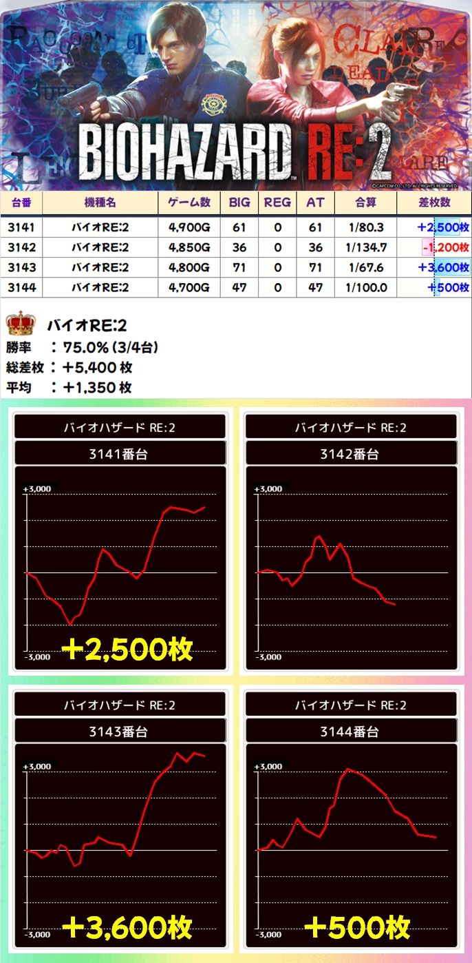 一方、バイオRE:2は全台フル稼働しており、台平均+1350枚と上々な結果になっていましたよ!