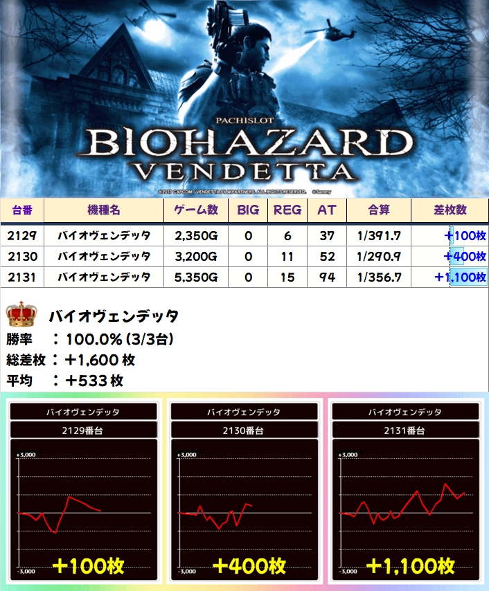 バイオヴェンデッタは稼働不足であまり出玉が伸びなかったようですが、しっかりプラス差枚になっていました。