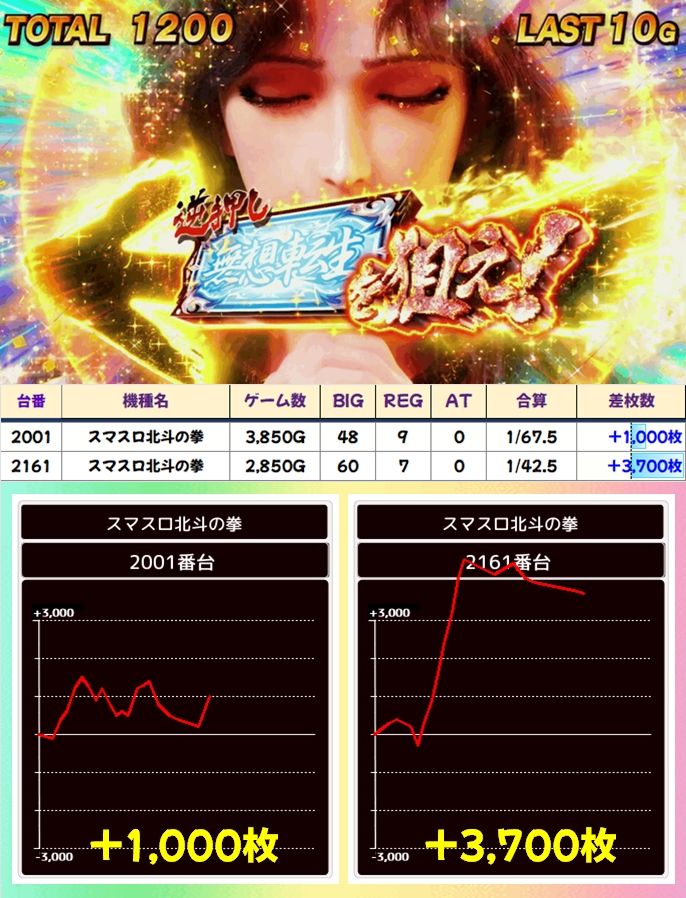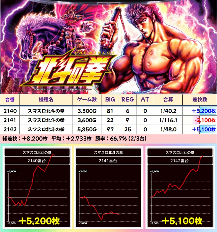 この日はスマスロ北斗に3台並びが用意されており、不発台があるものの台平均+2733枚と優秀な結果に!