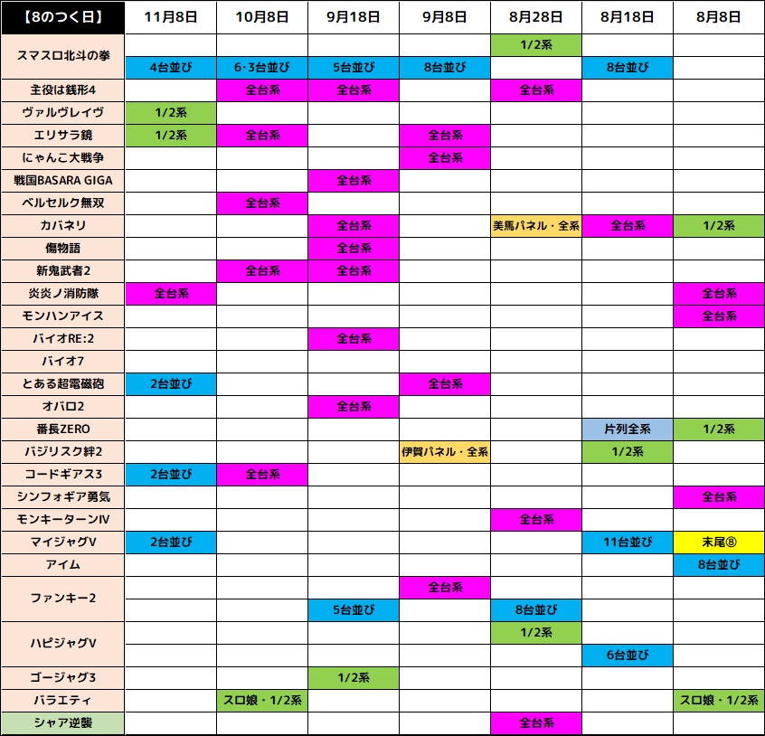 今回も傾向的に全台系・並びを中心とした仕掛けが用意されることが予想され、8のつく日恒例の「3台以上の機種に1台以上お宝台アリ」も狙い目に!