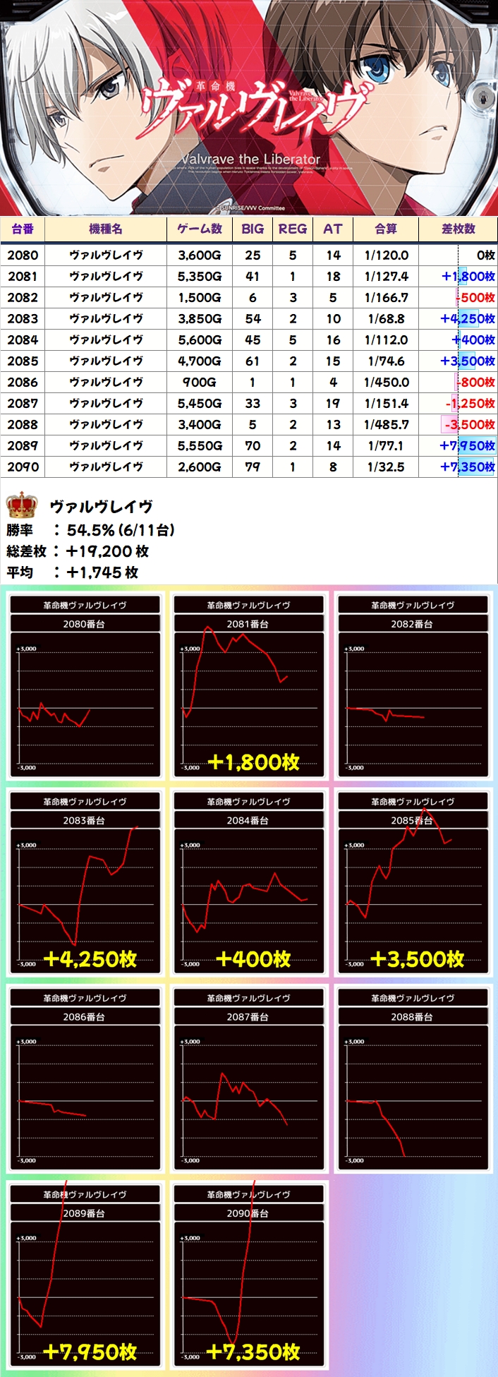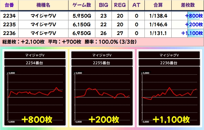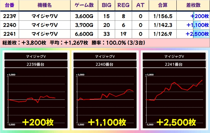 ヴヴヴは3000枚以上大量獲得台が4台もあったので、1/2系としてピックアップ。7000枚以上獲得している2台に関しては最高設定だった可能性もあり得るのではないでしょうか。