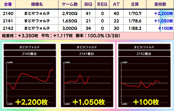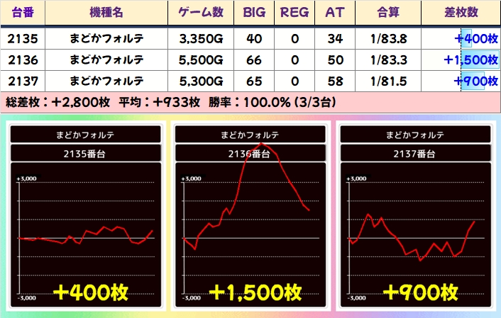 新台のまどかフォルテも3台並びが2ヶ所。こちらも全台プラスでフィニッシュ。新台なので稼働もヨシ!ホールの投入傾向に台がしっかりと応えました。