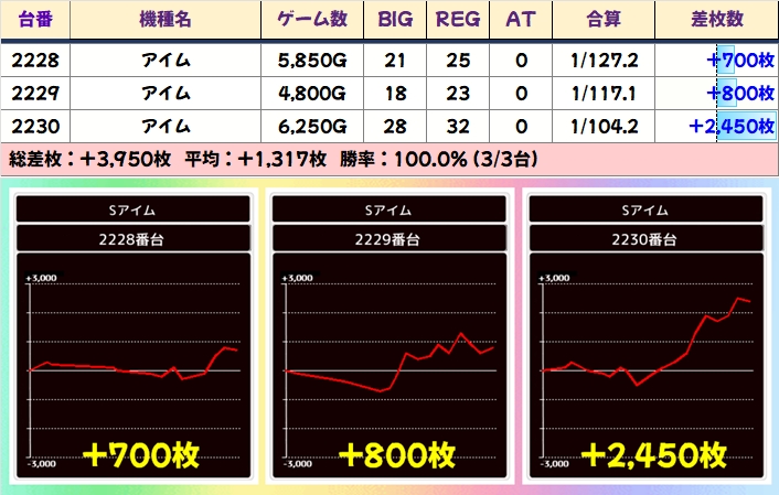 アイムにも3台並びがありました。こちらは全台プラス。これも稼働やREG回数を見れば間違いなく上でしょう。