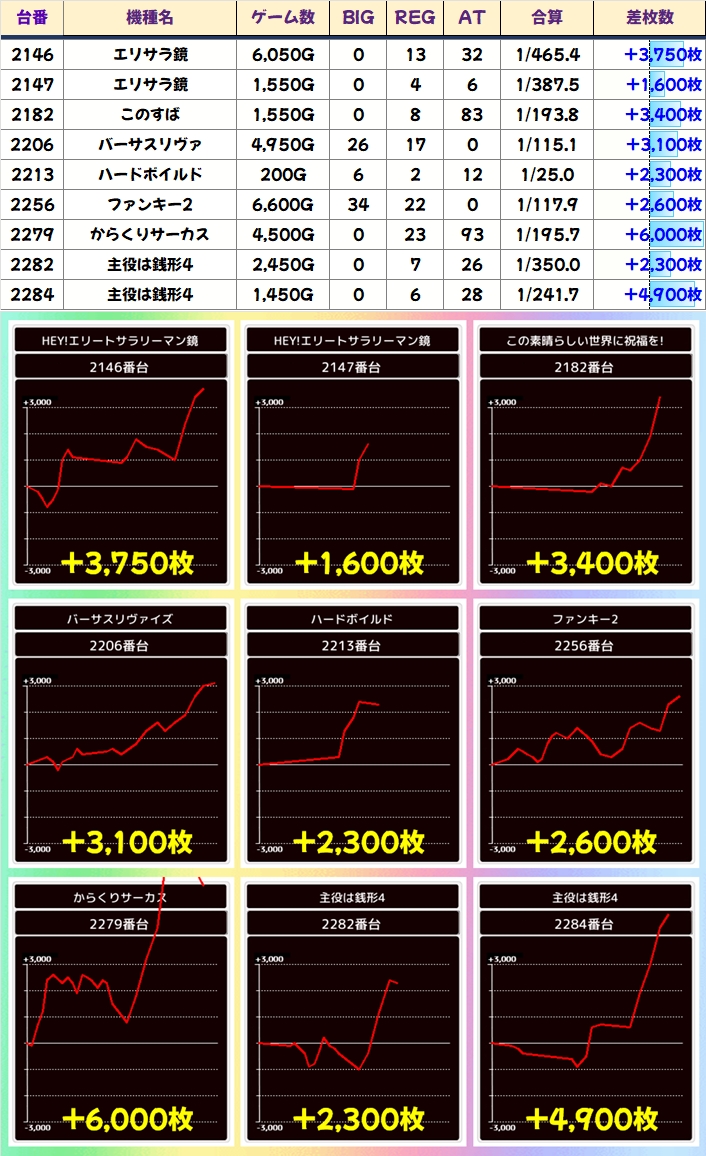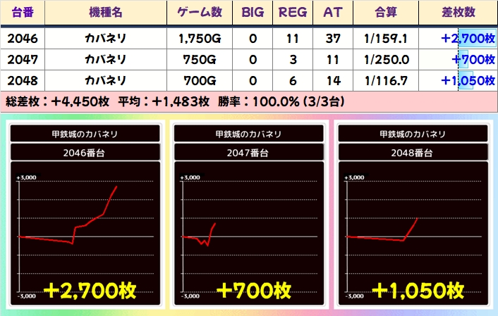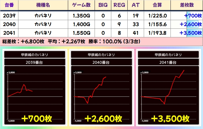カバネリは多台数あるので3台並び2カ所と手厚い仕掛け。全台プラスなうえにどちらも平均1000枚超。稼働が足りない台があるのがもったいないですね。