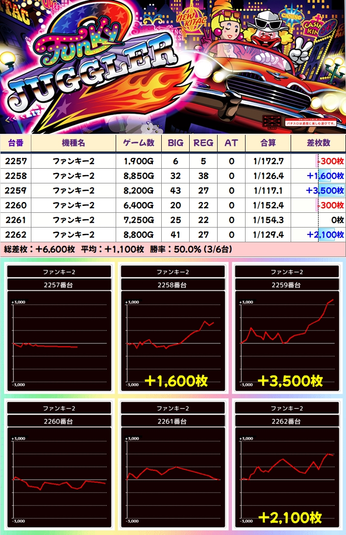 ファンキー2は6台並び。マイナス台はあるものの稼働からも良い要素が確認できたことが窺えます。ジャグは各シリーズ優秀台の並びがありました。