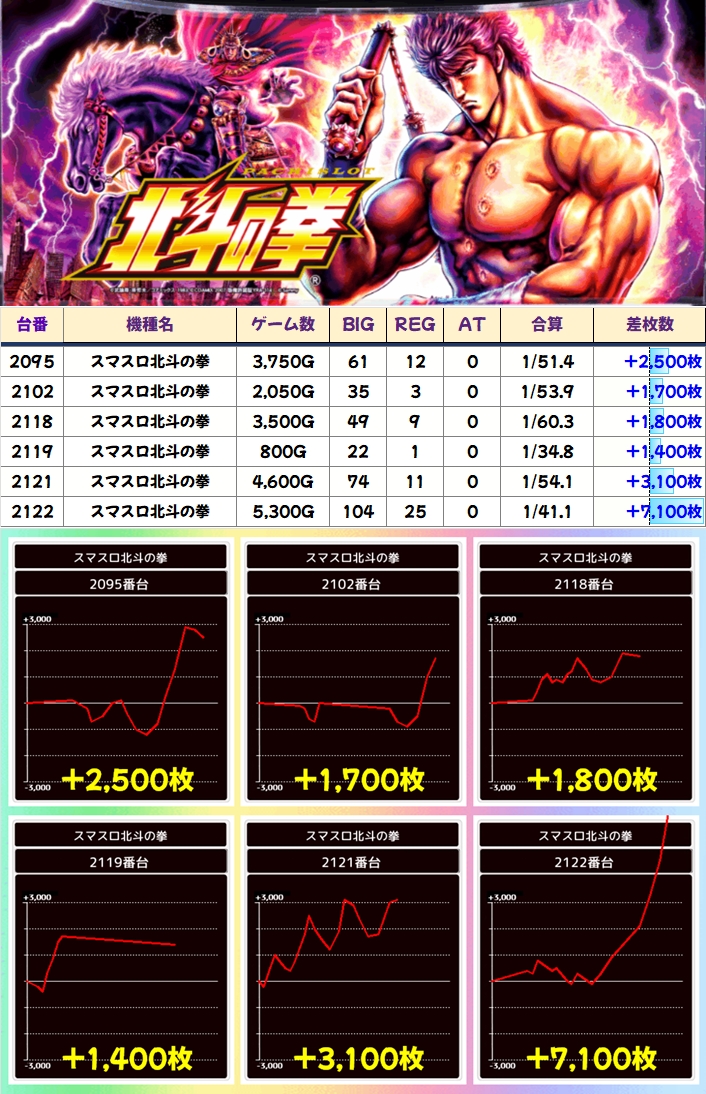 北斗も優秀台が多数あり、高配分だった模様。土曜日含む特日は北斗に毎回仕掛けが入っているので、積極的に狙うべき機種の一つですよ。