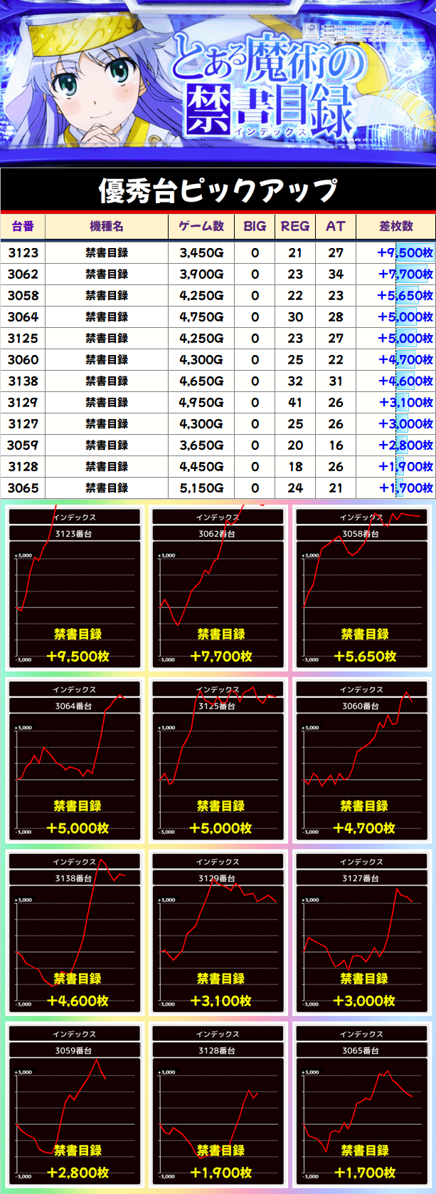 11/6導入の直近新台!万枚近い台もしっかり出ています!30台設置の「禁書目録」は30台中20台がプラスで機種総差枚+37,850枚、平均+1,262枚の結果に!