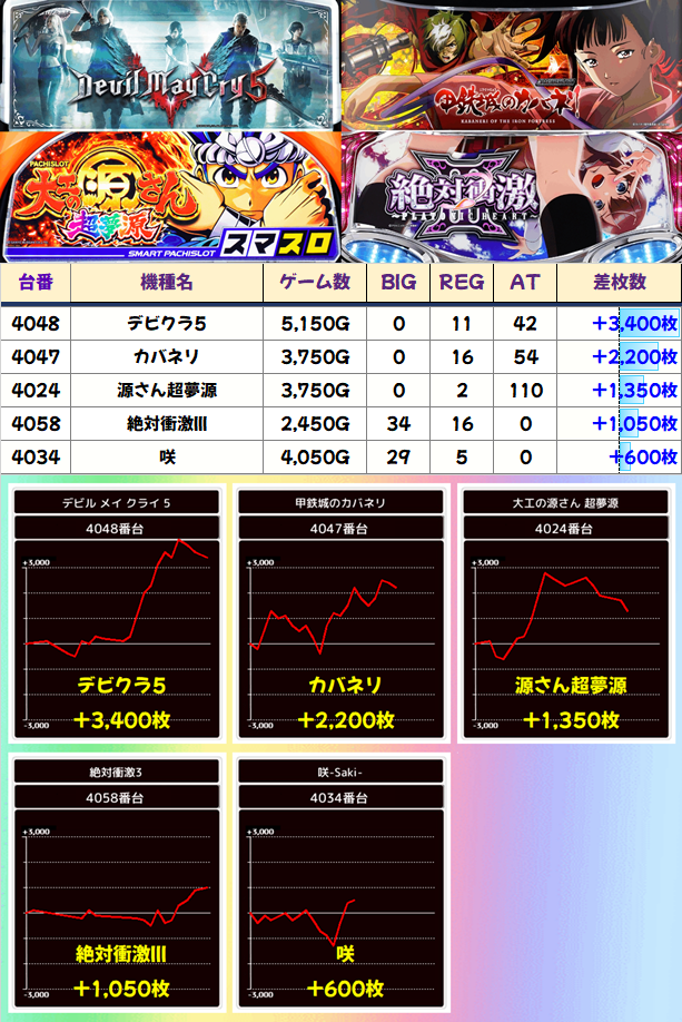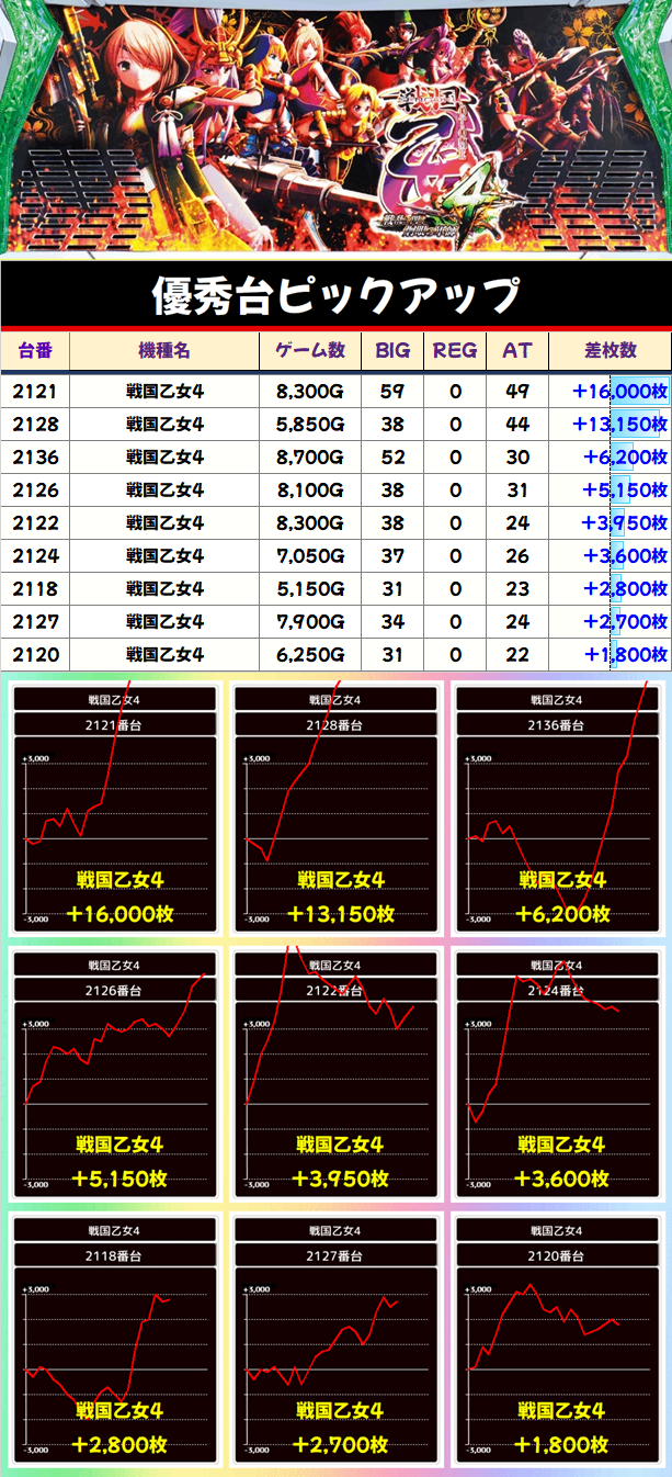 16000枚&13000枚が出ています!その他にも5000枚超える優秀台も!24台設置の「戦国乙女4」は24台中15台がプラスで機種総差枚+39,050枚、平均+1,627枚の結果に!