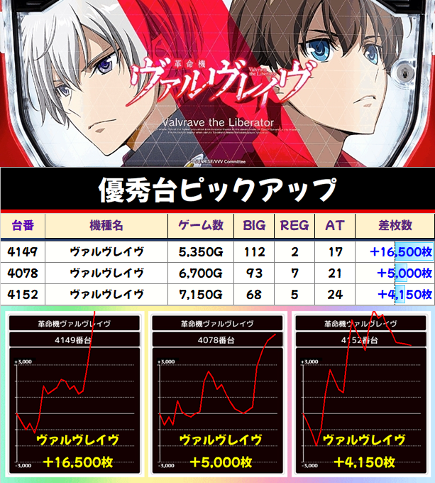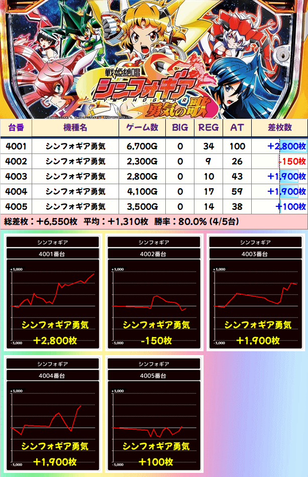 4/5台クラスももちろん全部でやってきます!5台設置の「シンフォギア勇気」は5台中4台がプラスで平均+1,310枚の結果に!