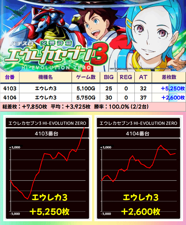 もちろんメインだけではありません!2台設置の「エウレカ3」は2台全台がプラスで平均+3,925枚の結果に!