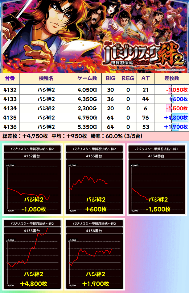 新しい機種も古めの機種も!5台設置の「バジ絆2」は5台中3台がプラスで平均+950枚の結果に!