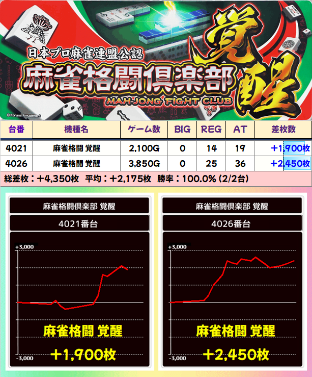 バラにある2台の機種まで!2台設置の「麻雀格闘 覚醒」は2台全台がプラスで平均+2,175枚の結果に!