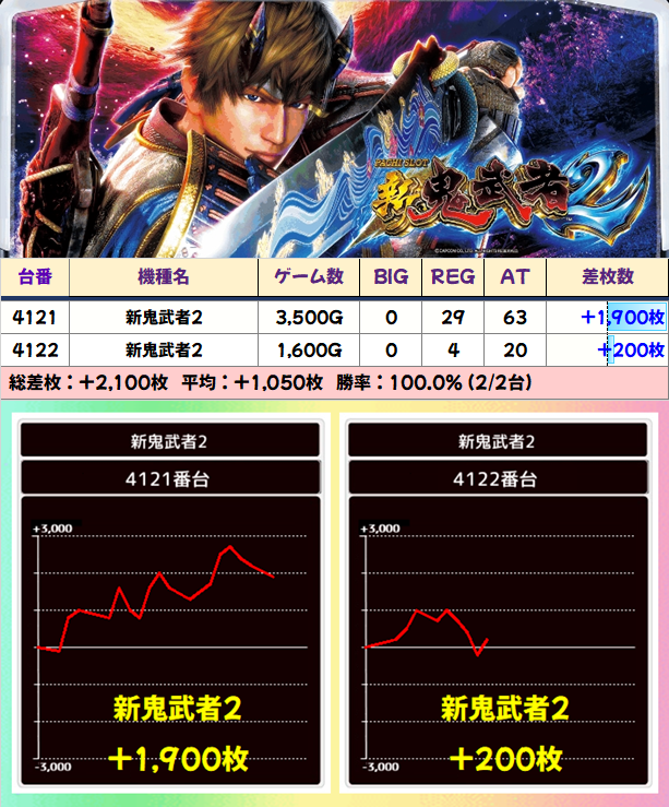 2台設置の「新鬼武者2」は2台全台がプラスで平均+1,050枚の結果に!