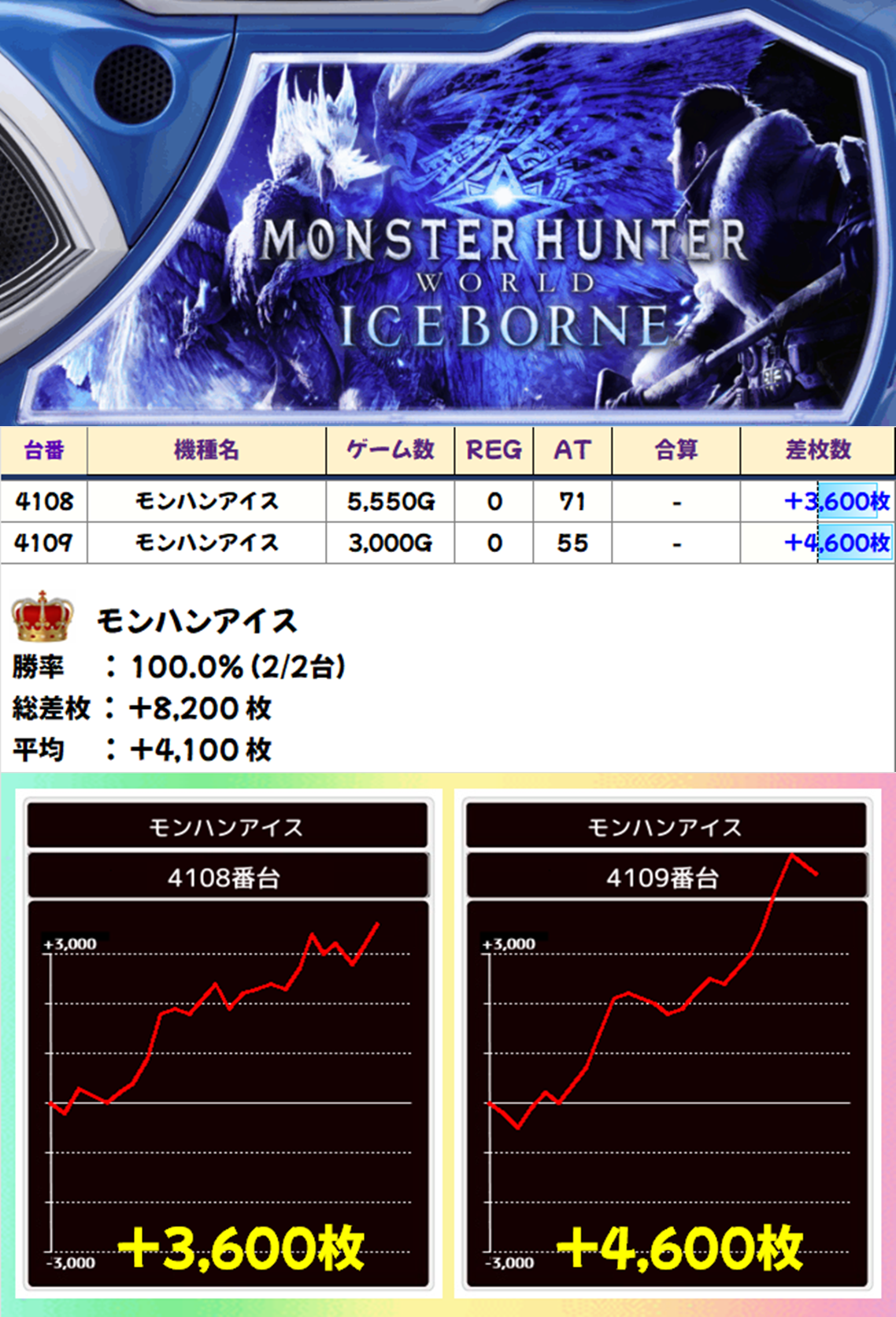 2台設置の「モンハンアイス」は全台がプラス差枚。総差枚+8200枚、平均差枚+4100枚の超好成績を収めました。
