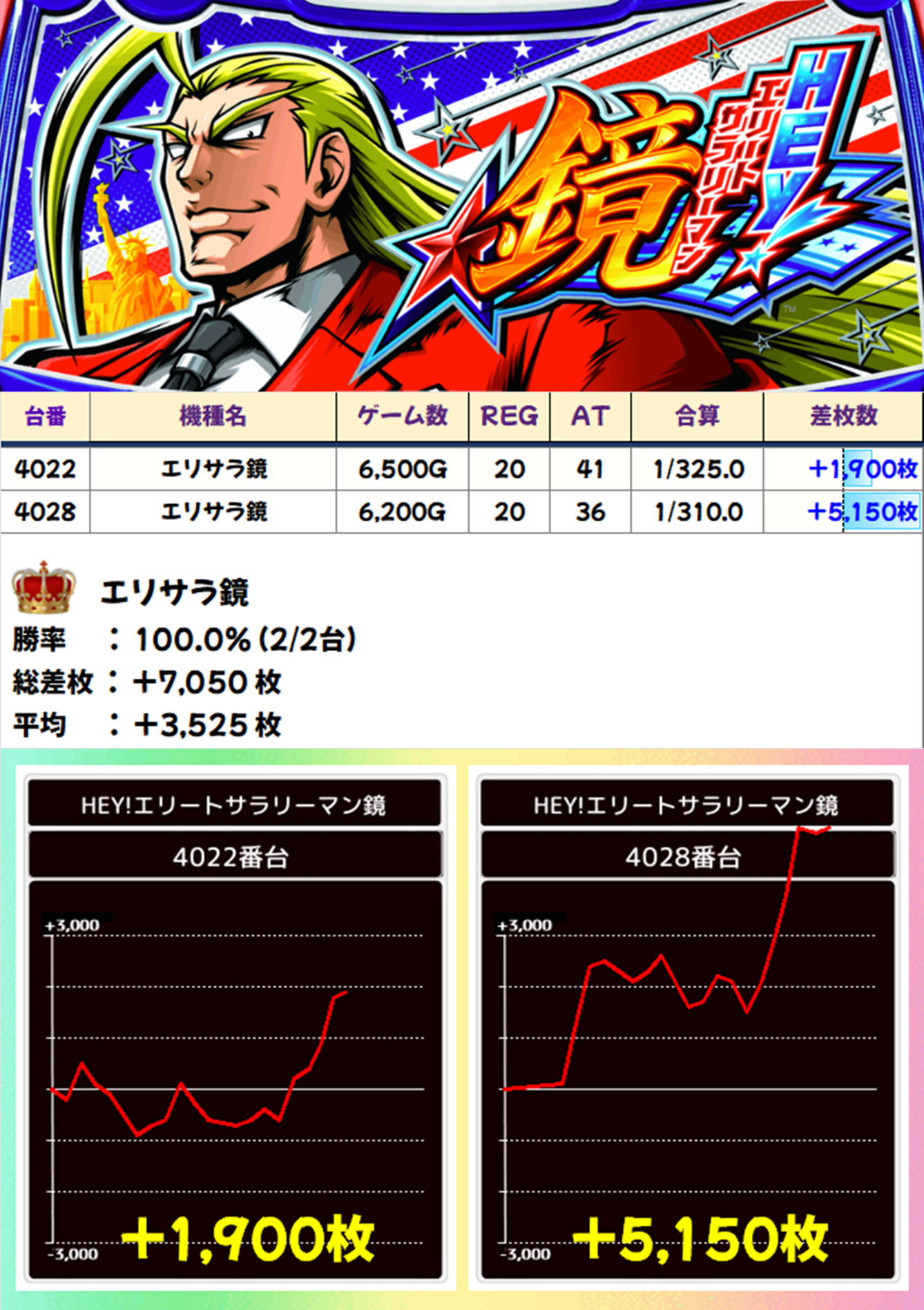 「エリサラ鏡」は平均差枚+3525枚で全台がプラス差枚。5000枚オーバーの爆発台も出現しました。