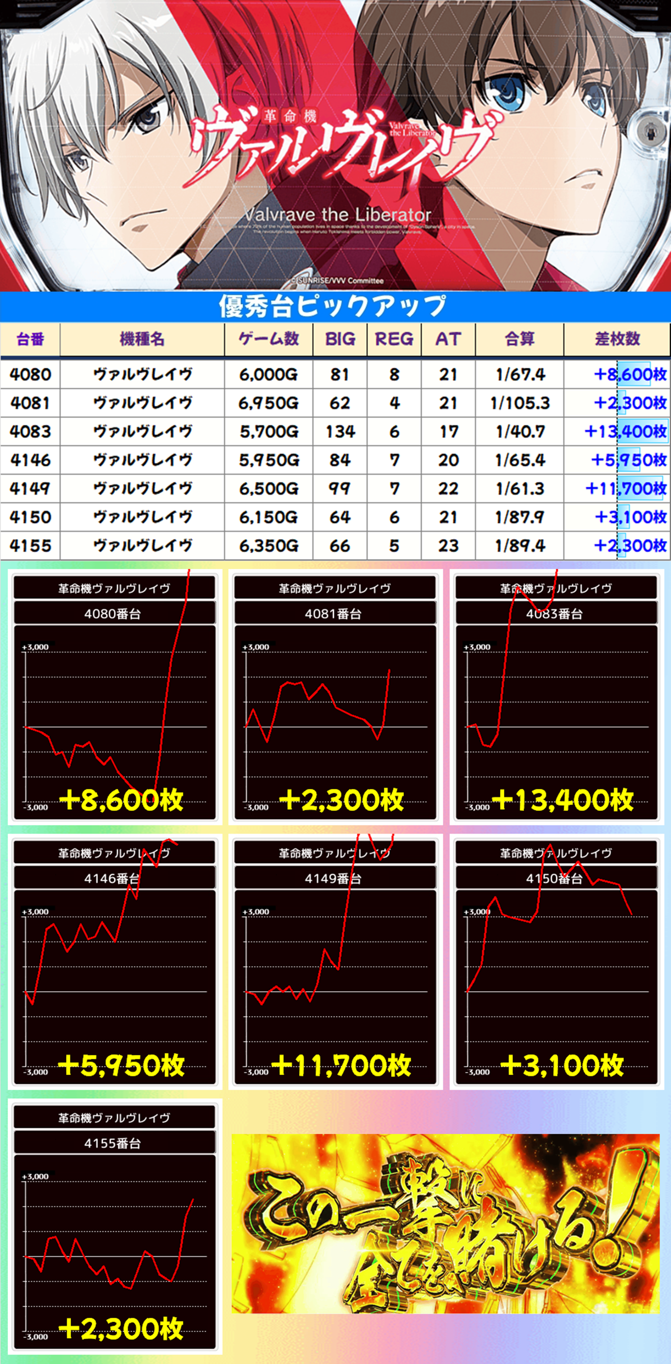 毎日オススメ機種の「ヴァルヴレイヴ」から大爆発台が複数出現。+13400枚、+11700枚と万枚を超える出玉も炸裂しました。