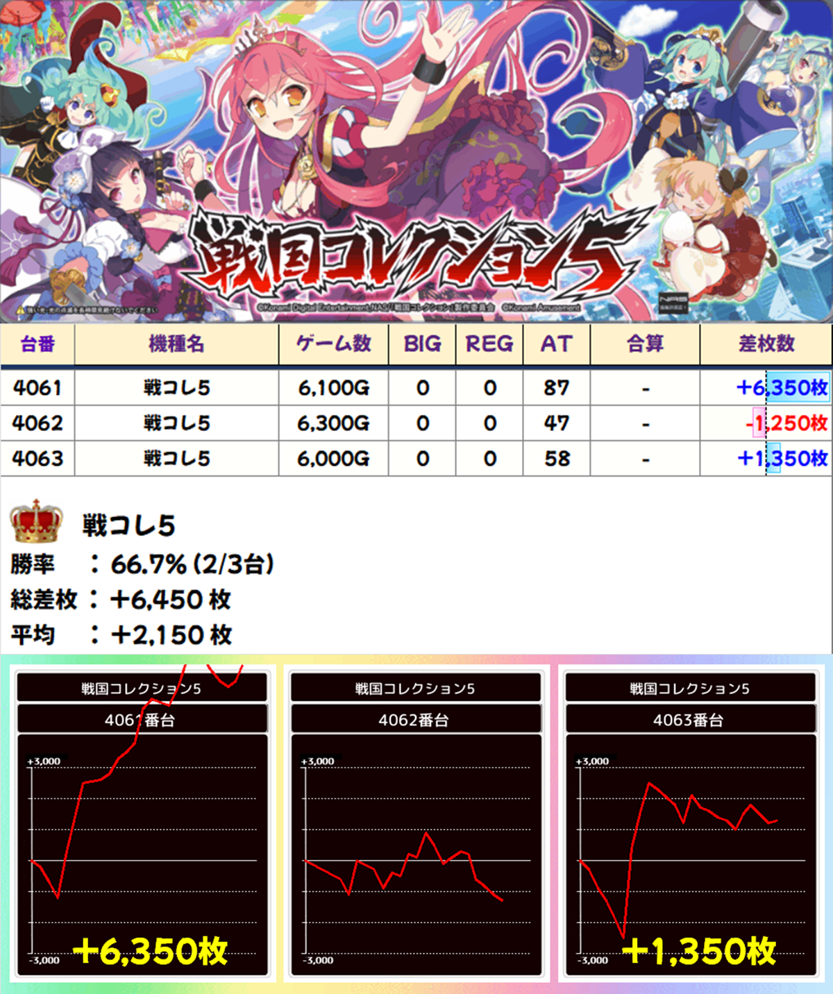 3台設置の「戦コレ5」は3台中2台がプラスで平均差枚+2150枚。4061番台は6000枚以上の出玉を獲得して大勝利!