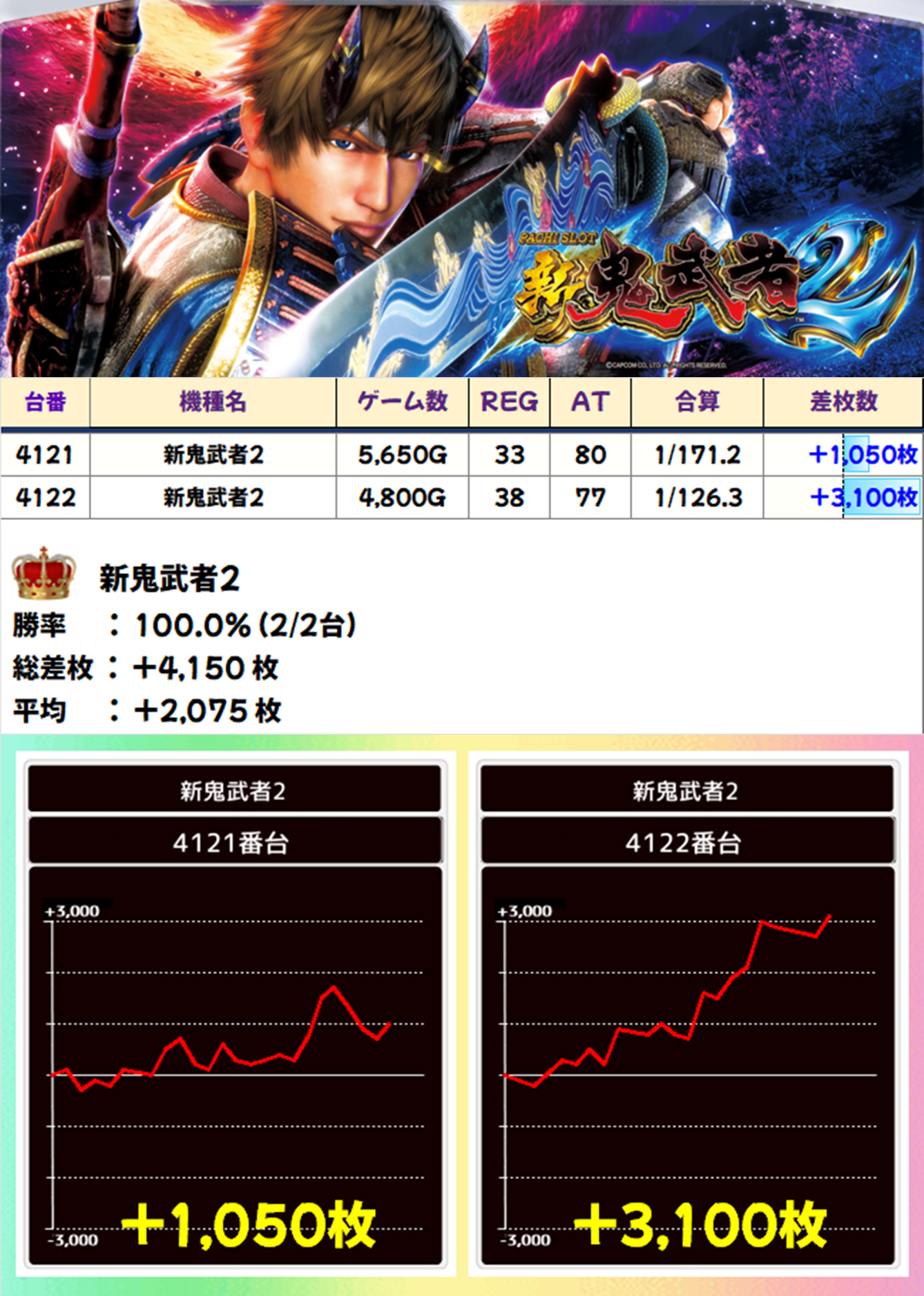 2台設置の「新鬼武者2」は平均差枚+2075枚で2台ともプラス差枚。右肩上がりのグラフを描いた4122番台が3000枚を出玉を獲得しました。