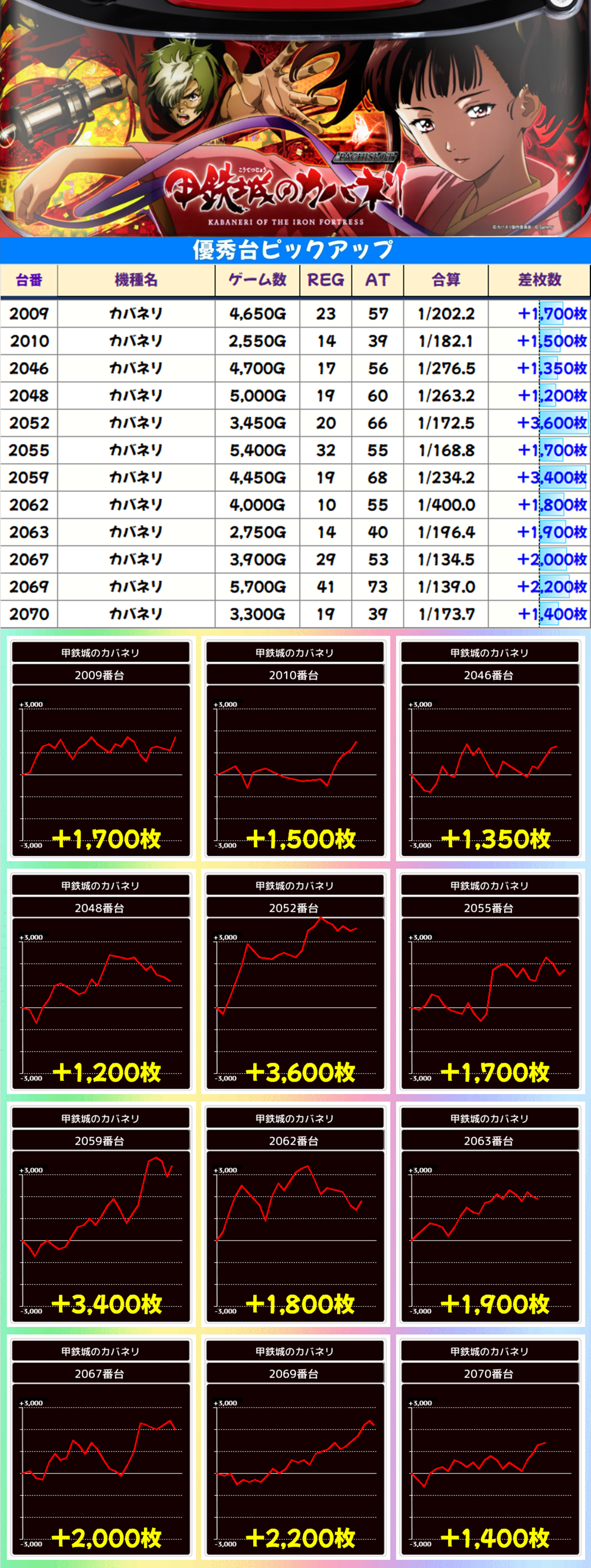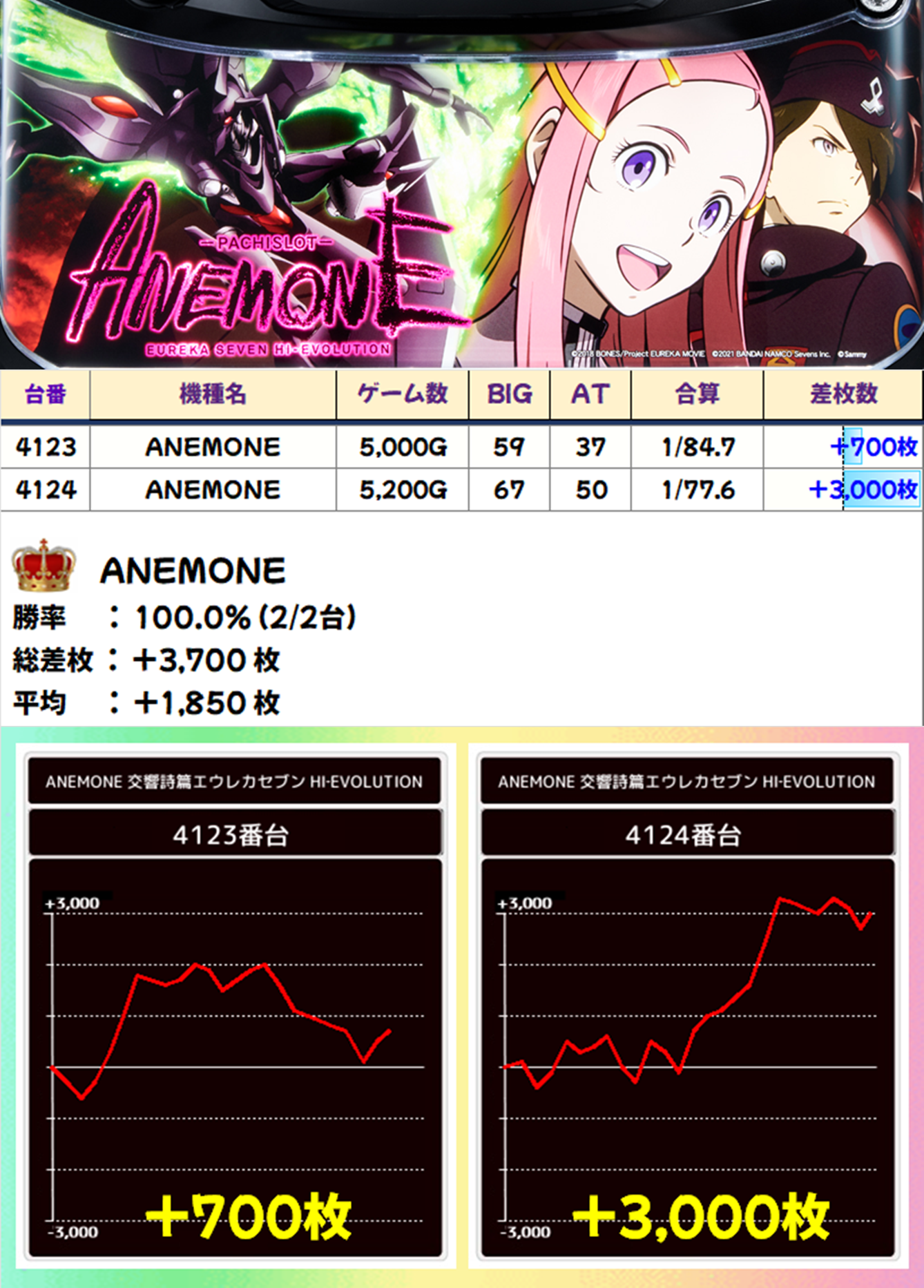 「ANEMONE」も全台プラス。3000枚のまとまった出玉を獲得した台が出現したので平均差枚+1850枚の好成績となりました。