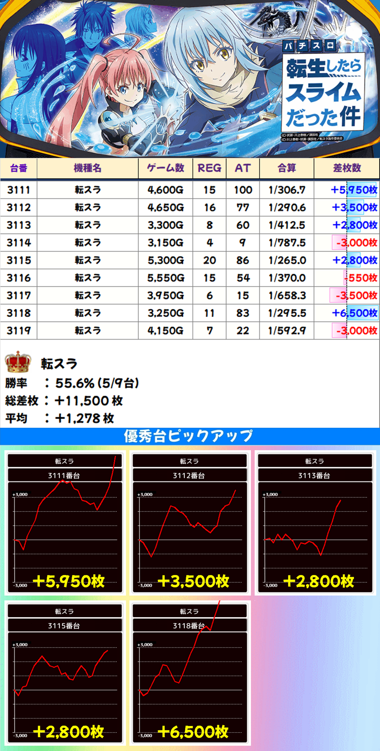 9台設置の「転スラ」は平均差枚+1278枚で5台がプラス差枚。プラスの5台は全て2500枚以上の出玉を獲得しました。