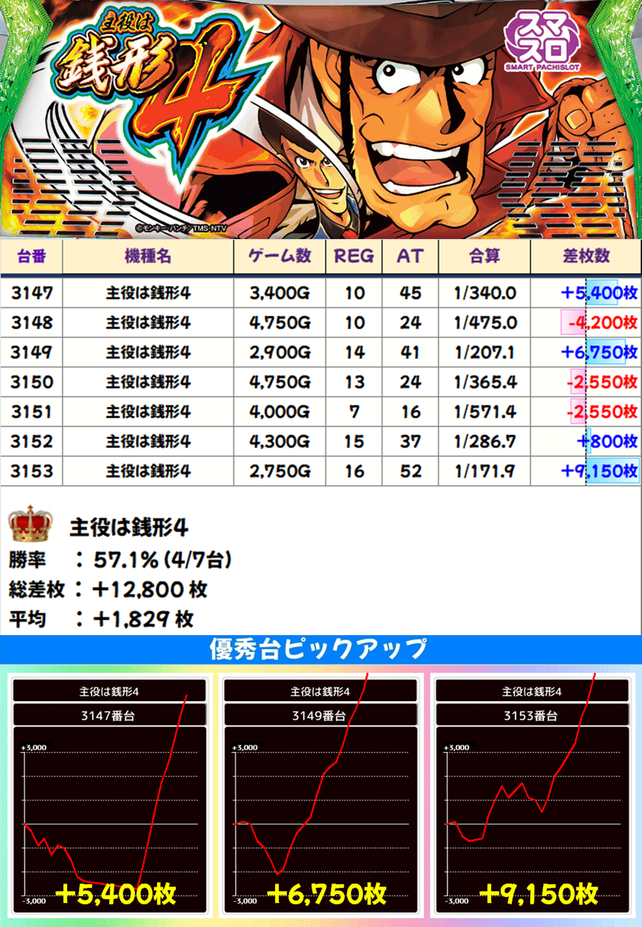 7台設置の「主役は銭形4」は4台がプラス差枚。+9150枚、+6750枚、+5400枚と3台が大爆発しました!