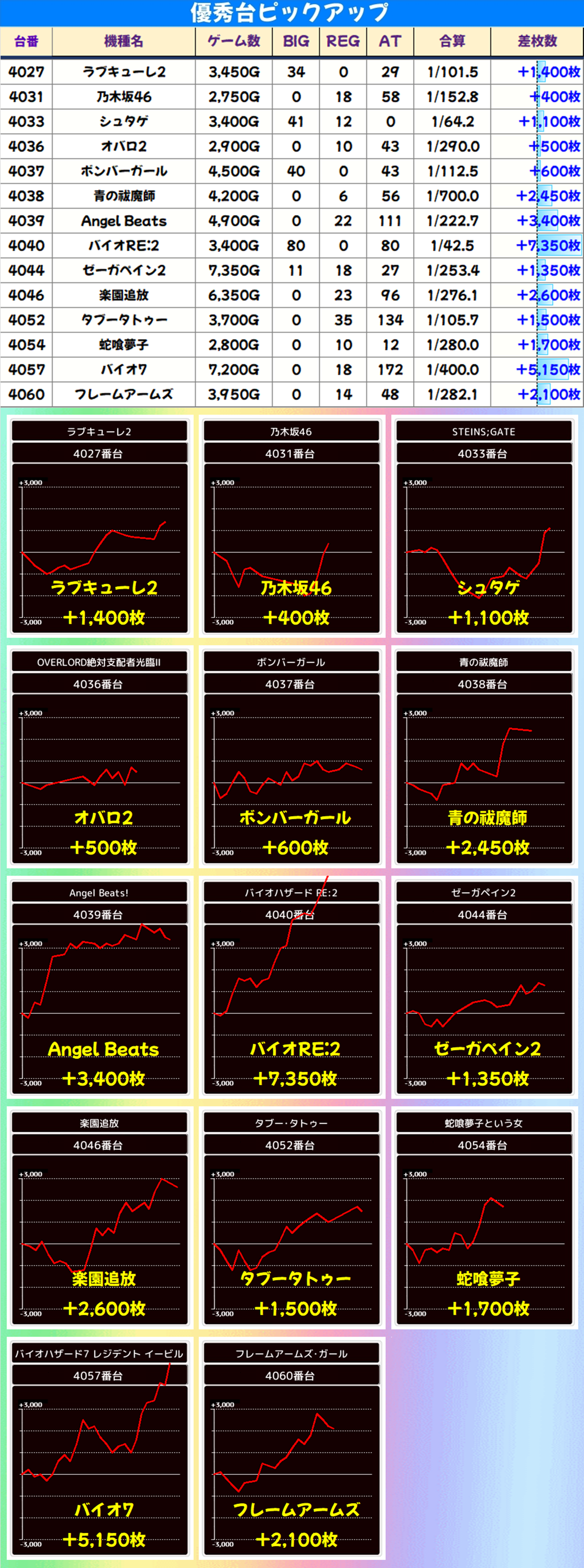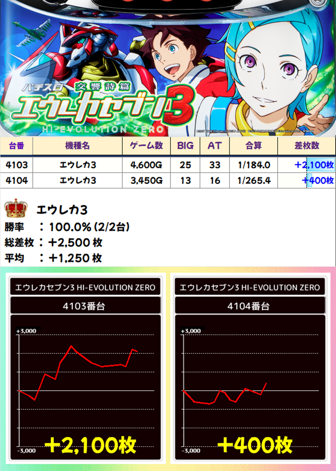 2台設置の「エウレカ3」は全台がプラス差枚。打ち込みが止まってしまった台がしっかり稼働していれば、もっとプラス差枚は増えていたでしょうね。