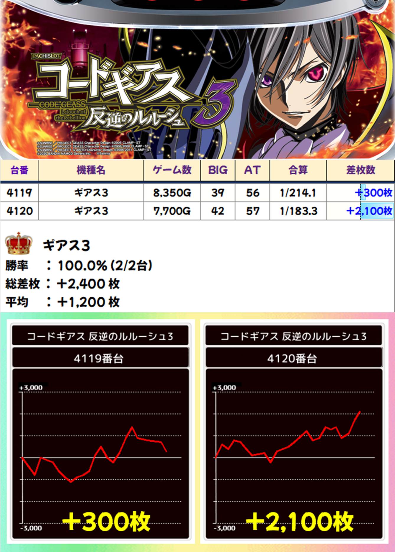 2台設置の「ギアス3」も全台プラス差枚。こちらは2台ともしっかり打ち込まれていたので、拠りどころとなる演出が出ていたと思われます。