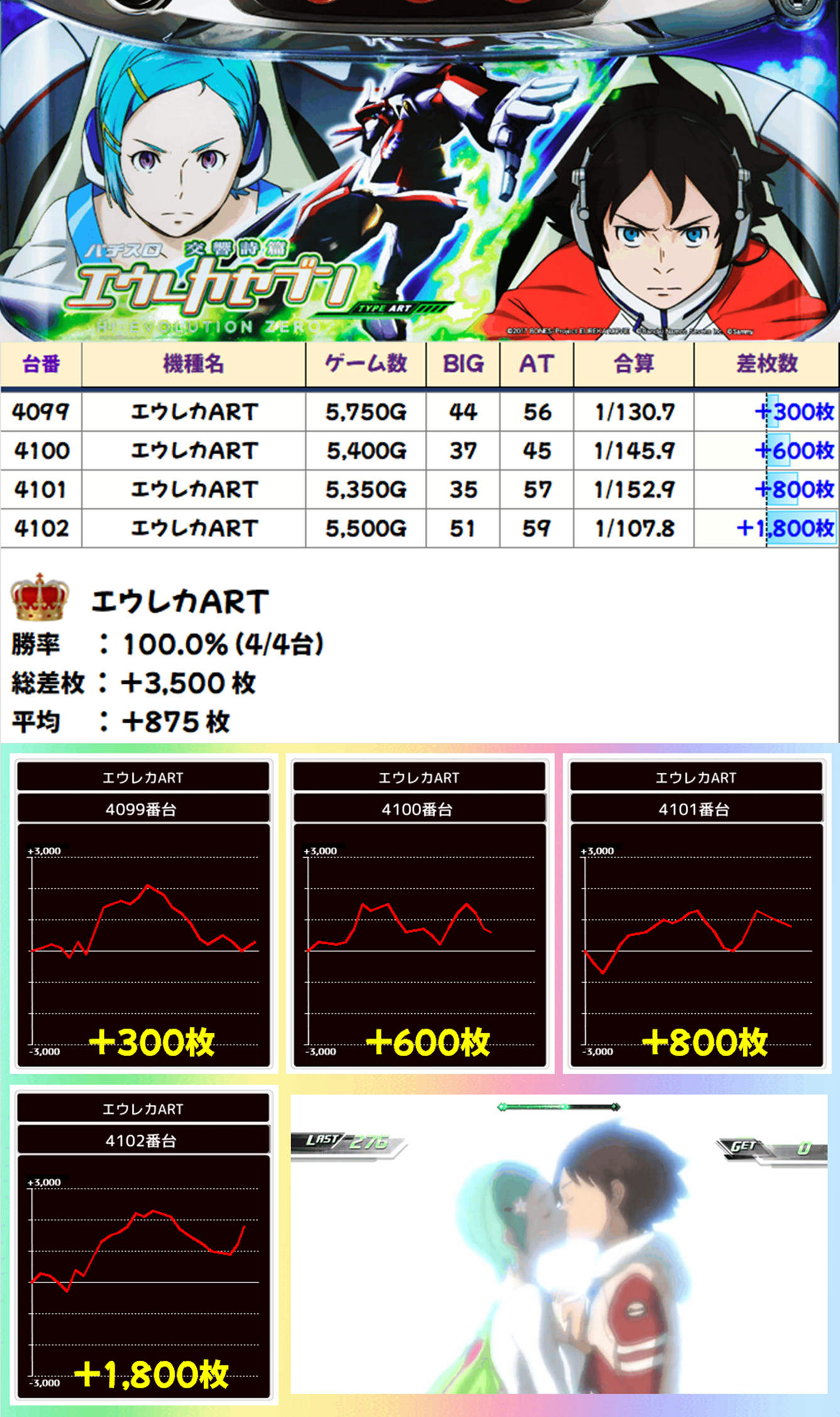 4台設置の「エウレカART」は平均差枚+875枚で全台プラス。ですが、4102番台以外の台はもうひと伸びできれば…ってところでしたね。