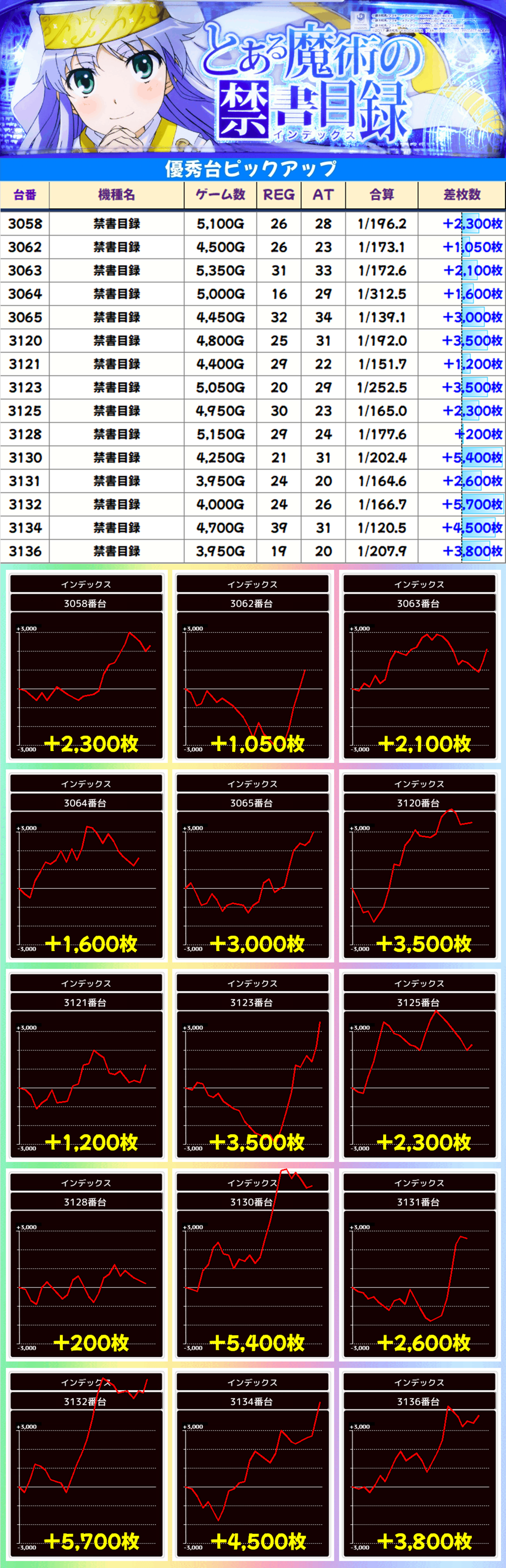 30台設置の「禁書目録」は平均差枚+530枚で30台中15台がプラス差枚。+5700枚を筆頭に14台が1000枚以上の出玉を獲得しました。