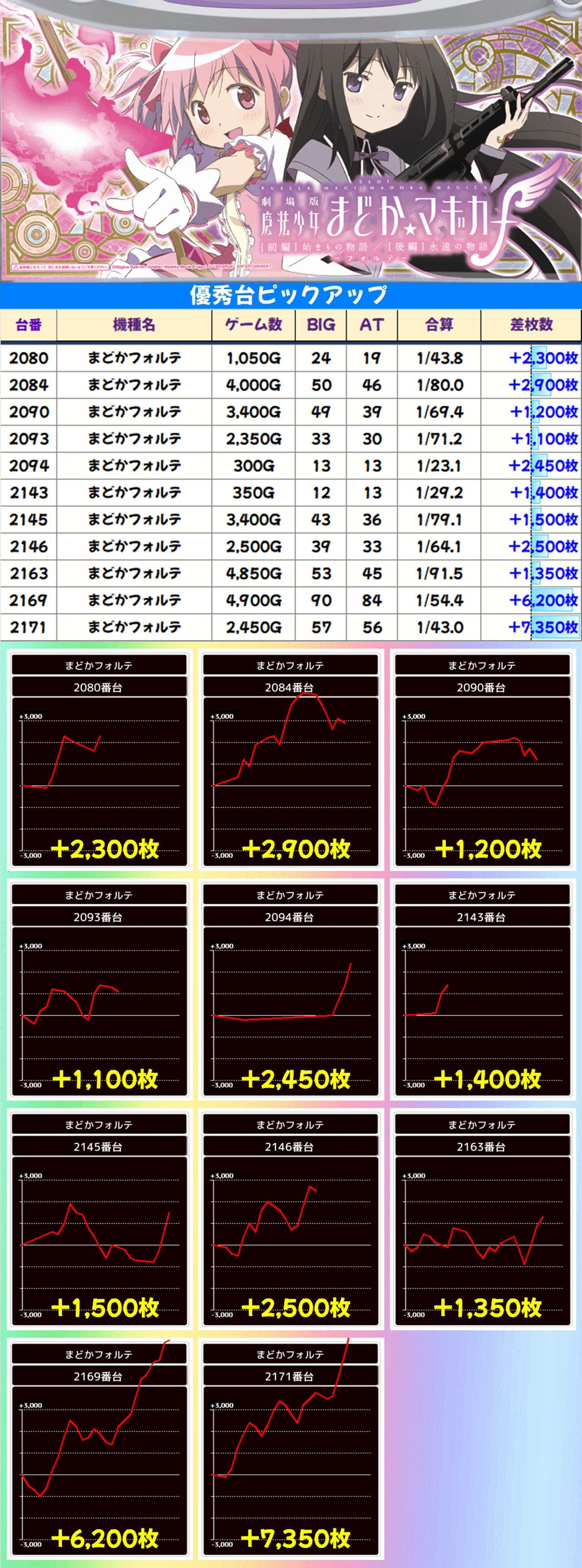 55台設置の「まどかフォルテ」は23台がプラス差枚。+7350枚、+6200枚と大爆発台が2台出現しました。