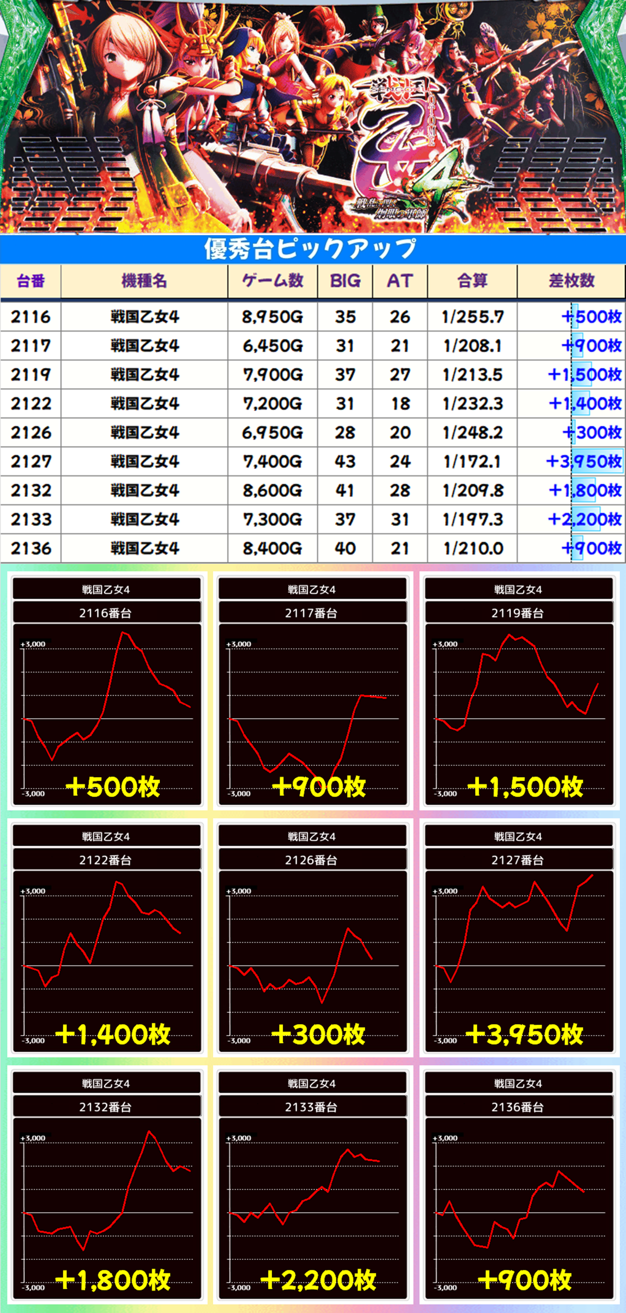 「戦国乙女4」も毎日オススメ。4000枚近い出玉を獲得した台もありましたが「戦国乙女4」の爆発力を考えたら本日は不発だったかも?