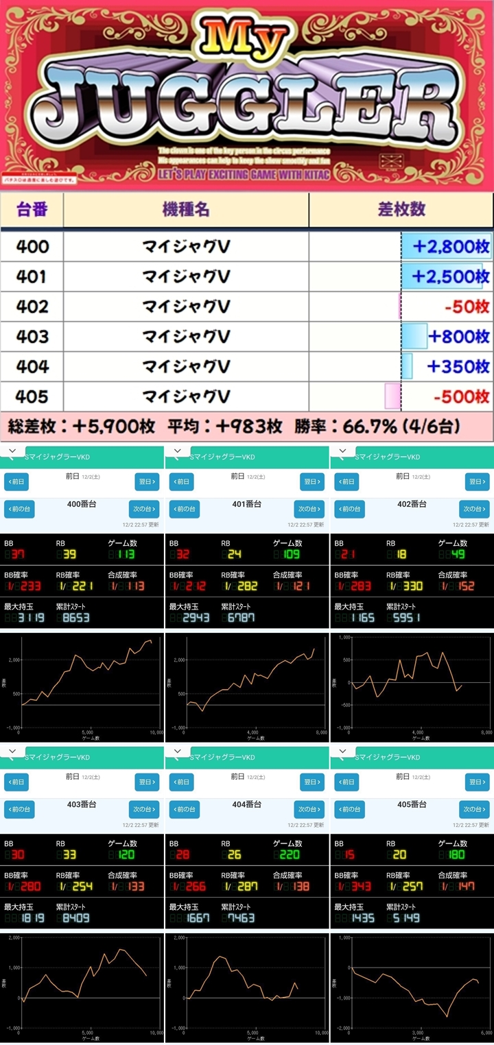 「マイジャグV」の6台並びは打ち込み不足の2台を除いてプラスに! +2000枚以上のゴリゴリの台が複数あったのもポイントです!