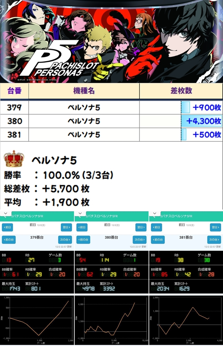 「ペルソナ5」は+4300枚を筆頭に全台プラスで平均+1900枚を達成!