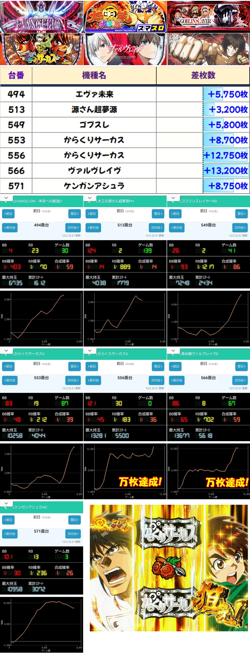スマスロは優秀台の宝庫でしたが、中でも556番台「からくりサーカス」と566番台「ヴヴヴ」は万枚を達成しました!