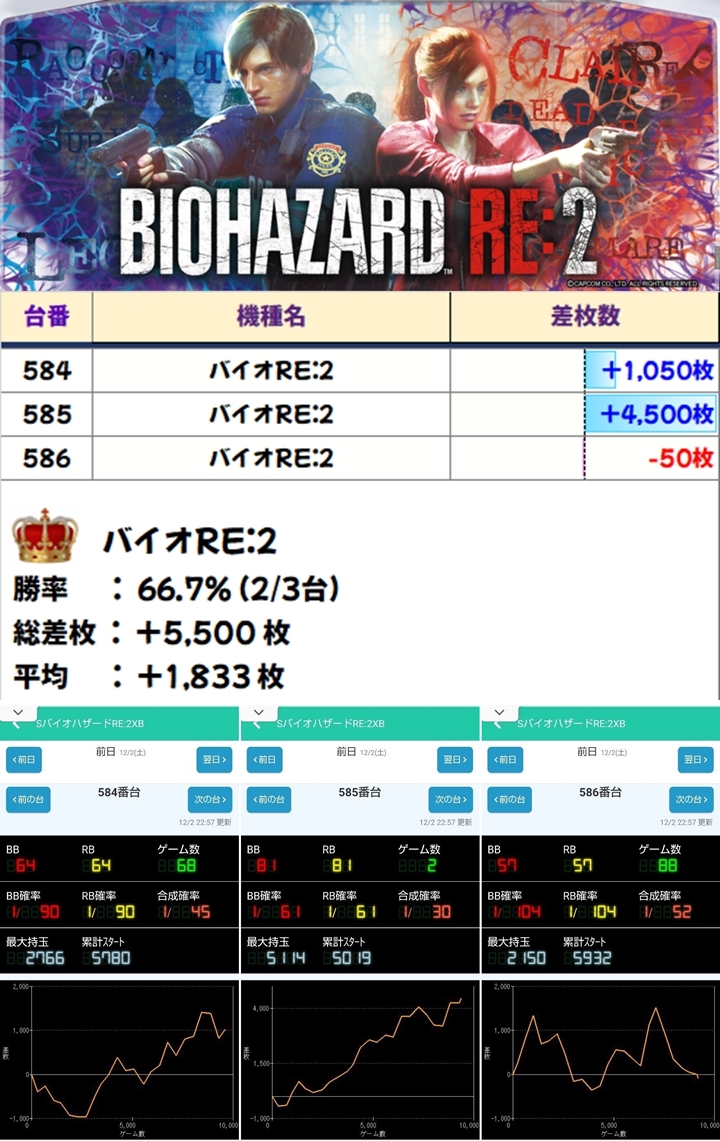 「バイオRE:2」も全台系に! こちらにも+4500枚という素晴らしい台がありました! それにしても綺麗な右肩上がりですな~。
