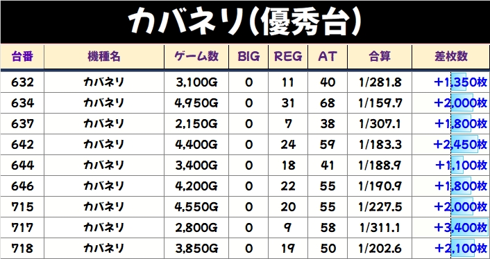 カバネリも全系並びの再掲&単品優秀台をピックアップしておきます。北斗よりも出玉の派手さはないものの、北斗と同じくらいプラス台は多かったです。サミーの看板機種+スーパーエンジョイ機種なので、サミー機種の中でも扱いは別格ですね。